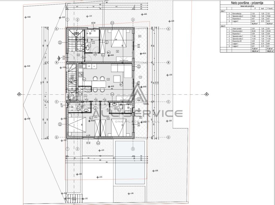 Razizemlje, prizemlje i kat se sastoje od ukupno 4 stambene jedinice i 5 vanjskih parkirnih mjesta od kojih svaki stan ima vlastiti odvojeni ulaz.