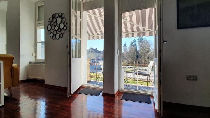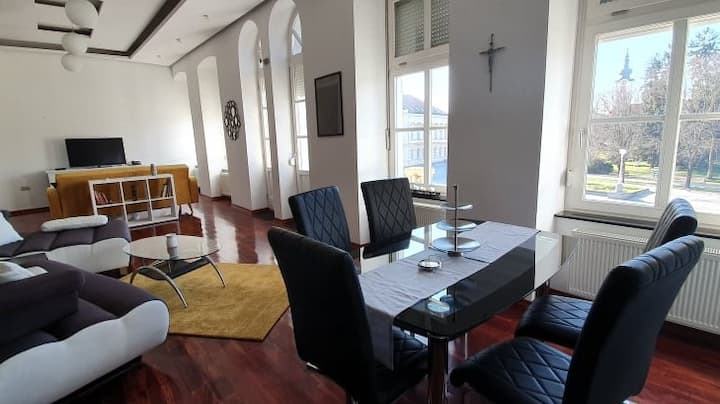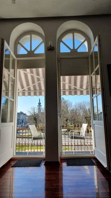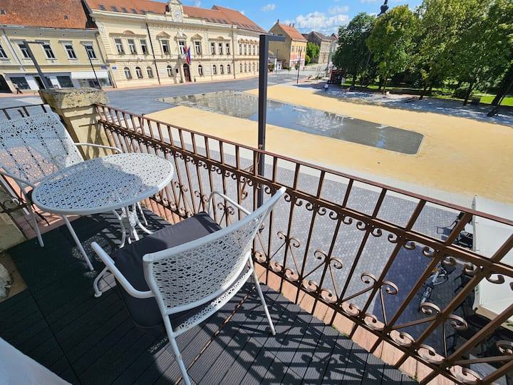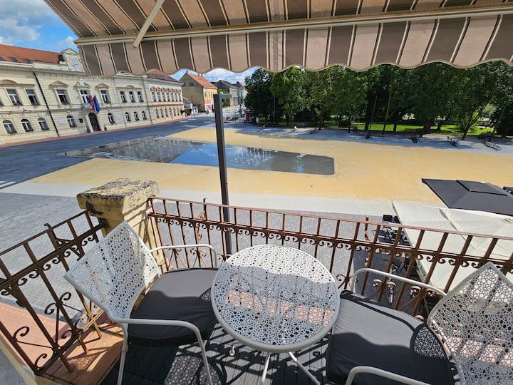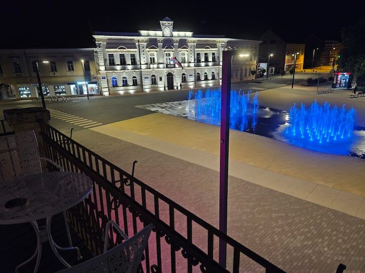 Eksluzivan, poseban stan na izuzetnoj lokaciji, glavnom gradskom trgu, u zgradi, na 1. katu. Pogled na gradski park, trg, gradsku vijećnicu. S obzirom na svoju izuzetnu lokaciju, svi potrebni sadržaji za život nalaze se na svega nekoliko koraka od stana, trgovine, tržnica, bolnica, škole, društveni sadržaj, strogi centar,... Uz stan idu i 2 garaže u dvorištu, ulaz u njih i dvorište iz Svilarske ulice, ulaz u stan direktno u haustor, s trga.