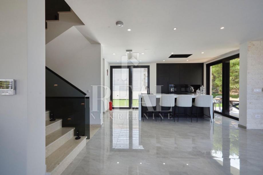 Okućnica vile površine 591 m2 je ugodna, prati je travnjak dok je na stražnjoj strani velika terasa sa sunčalištem i velikim grijanim bazenom.