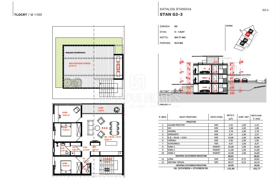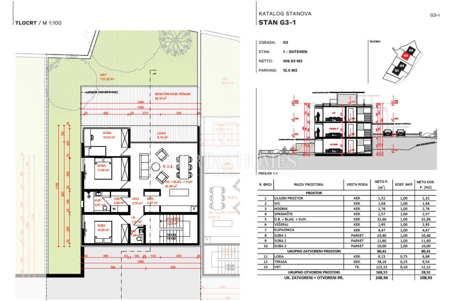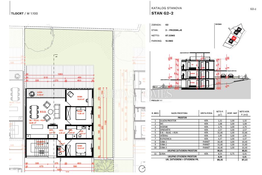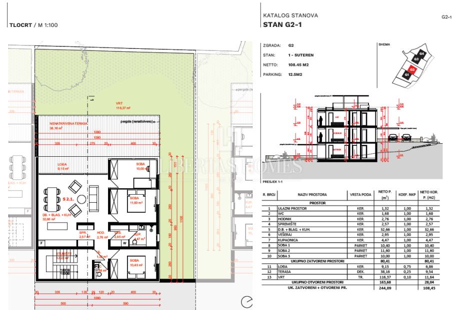 Kvadrature interijera svih jedinica su oko 80 m2, dok ovisno o pripadcima pojedinom stanu u vidu vrtova, loggia ili terasa, neto korisne površine se kreću od 87 m2 do 108 m2.