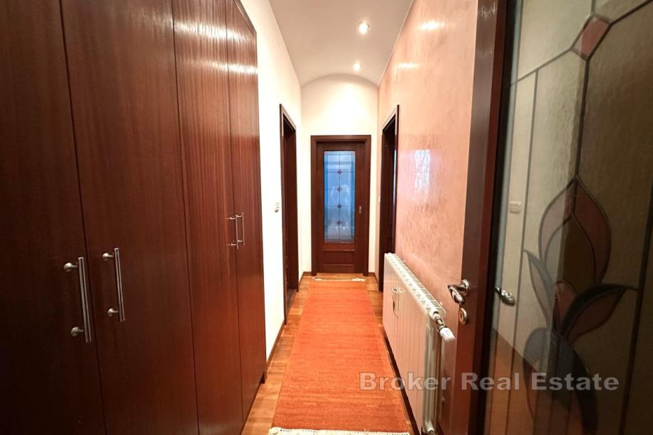 Interijer odiše toplinom i profinjenošću – podovi su izrađeni od američke trešnje, unutarnja stolarija od mahagonija, dok su vrata hodnika ukrašena elegantnim vitražima. Stan se sastoji od dvije spavaće sobe, opremljene kupaonice i dodatnog gostinjskog WC-a. Velika i svijetla dnevna soba s blagovaonicom stvara ugodnu atmosferu, kao i potpuno namještena kuhinja renomiranog brenda Scavolini.