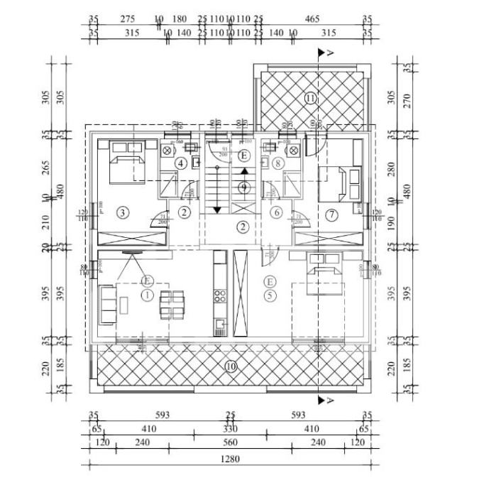 Kroz cijelu etažu potkrovlja prostire se stan "E" i sastoji se od prostranog dnevnog boravka s kuhinjom koji imaju izlaz na terasu, tri spavaće sobe (od kojih dvije imaju izlaz na terasu), dvije kupaonice i hodnika, te ima ukupnu površinu 112.14 m2. Stanu pripadaju spremište površine 8.34 m2 smješteno u podrumu zgrade, kućni vrt od 300.00 m2, parkirališno mjesto i pomoćna zgrada površine 38.20 m2.