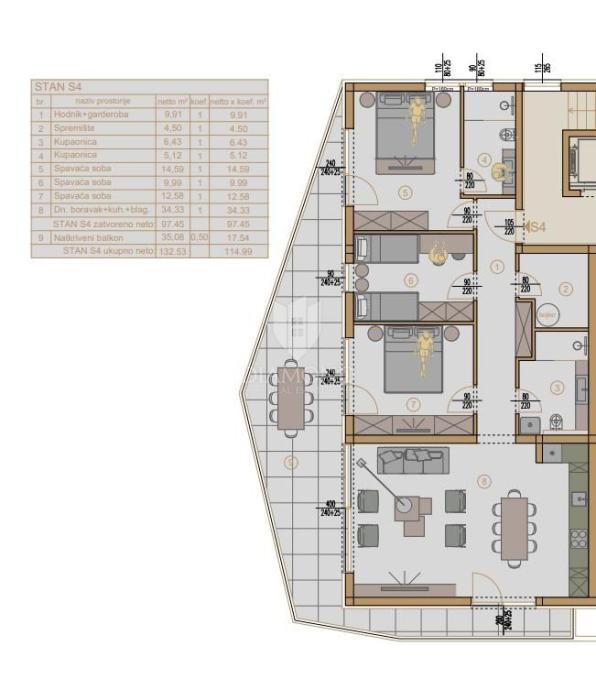 Ovaj prekrasan stan sastojati će se od hodnika s garderobom, tri spavaće sobe od kojih dvije imaju izlaz na prostranu terasu, dvije kupaonice, ostave, dnevnog boravka povezanog s kuhinjom i blagovaonicom koji također imaju izlaz na terasu, što čini ukupnu kvadraturu stana od 115 m2. Uz stan dolaze i dva parkirna mjesta koja se mogu birati između garažnih ili vanjskih te se dodatno i naplaćuju.