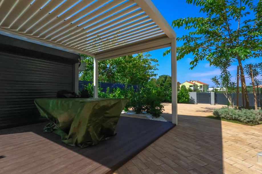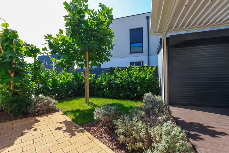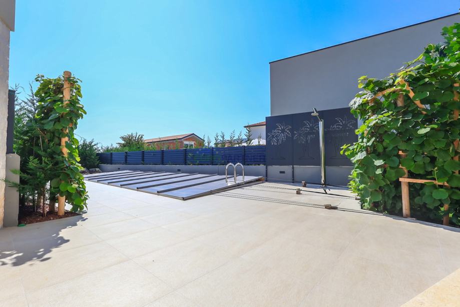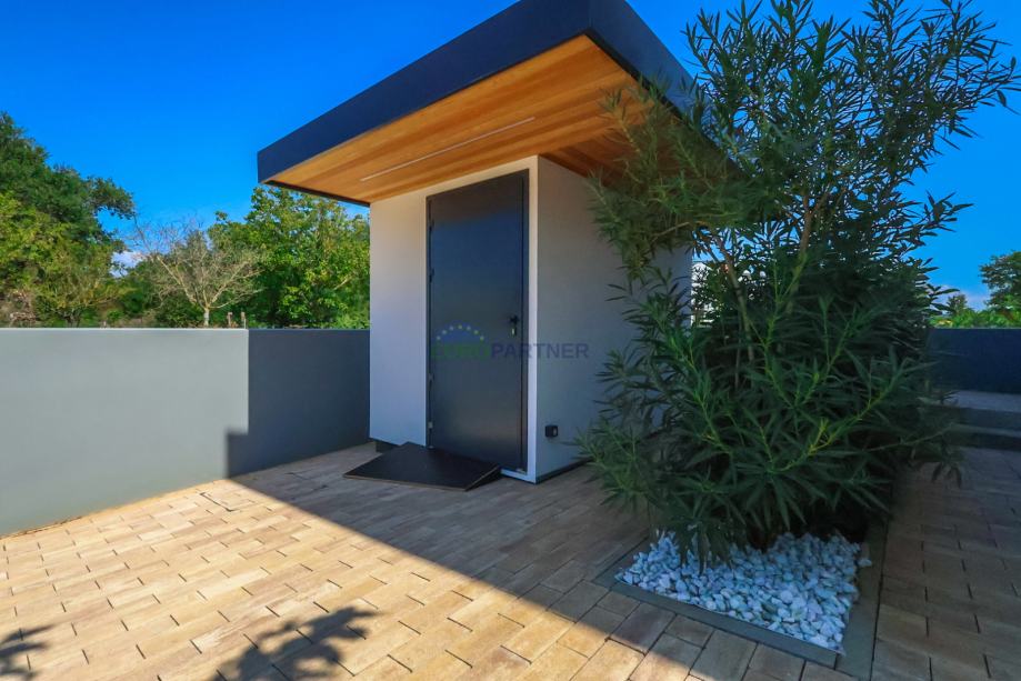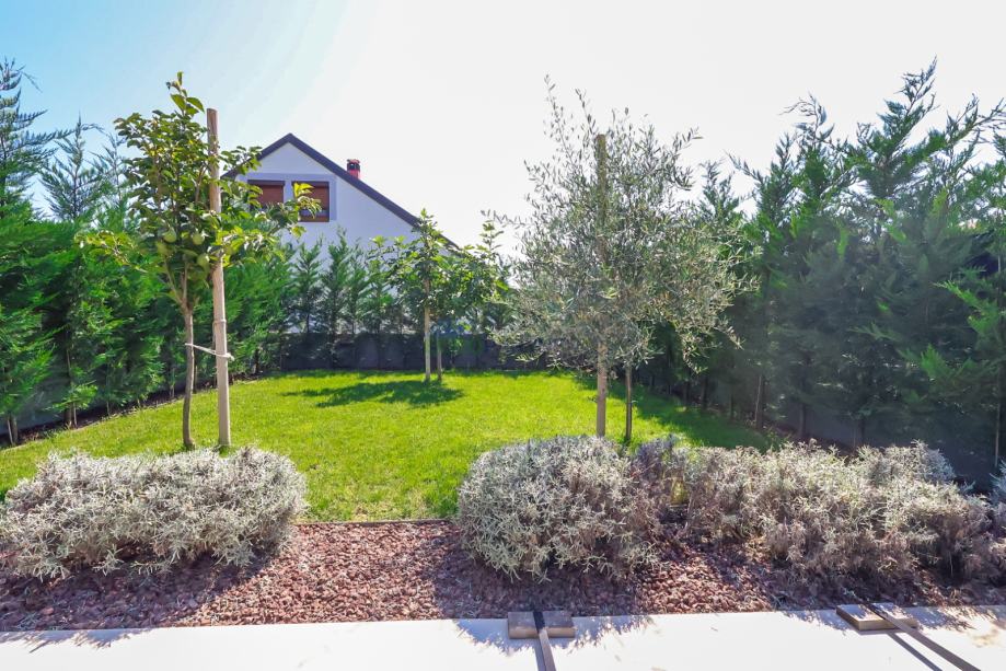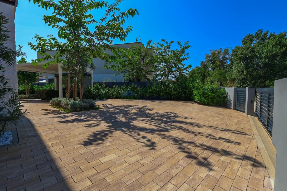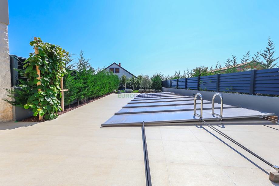 Okućnica je do najsitnijih detalja uređena kao mala privatna oaza – središnji dio zauzima bazen od 32 m2 sa sunčalištem u čijem nastavku je prekrasan travnjak sa zasađenim mediteranskim stablima voća . Ispred glavnog ulaza nalazi se natkrivena ljetna kuhinja za ugodna druženja s prijateljima te dva parkirna mjesta unutar dvorišta. Za potrebe spremanja stvari koje se koriste u vanjskom prostoru vlasnik je postavio ostavu nadopunjenu nadstrešnicom s Led rasvjetom za bicikle ili motor.