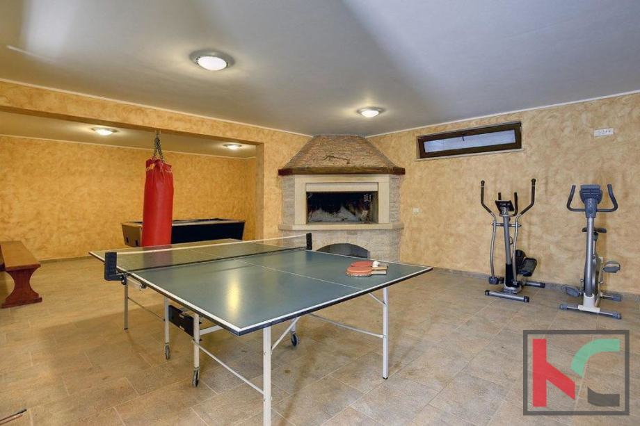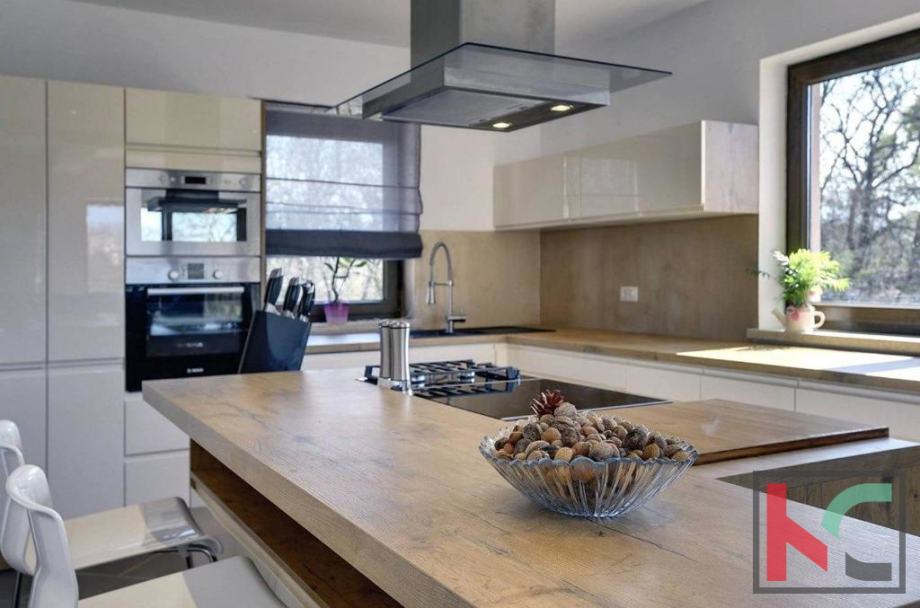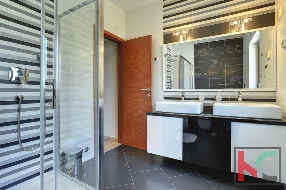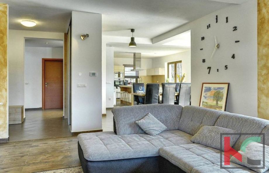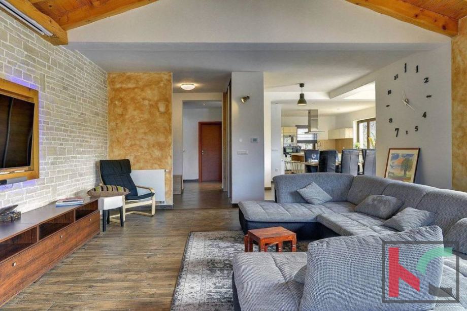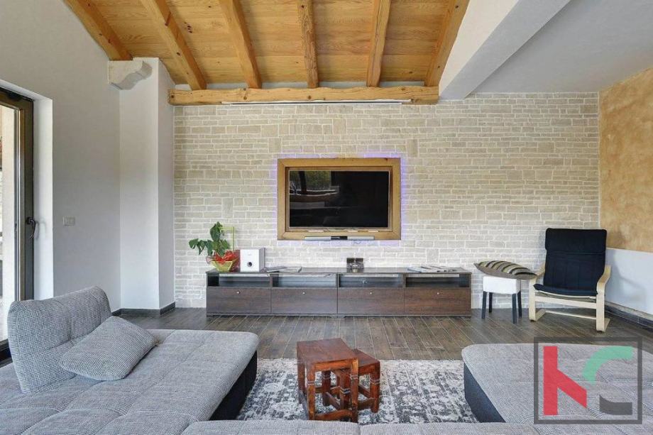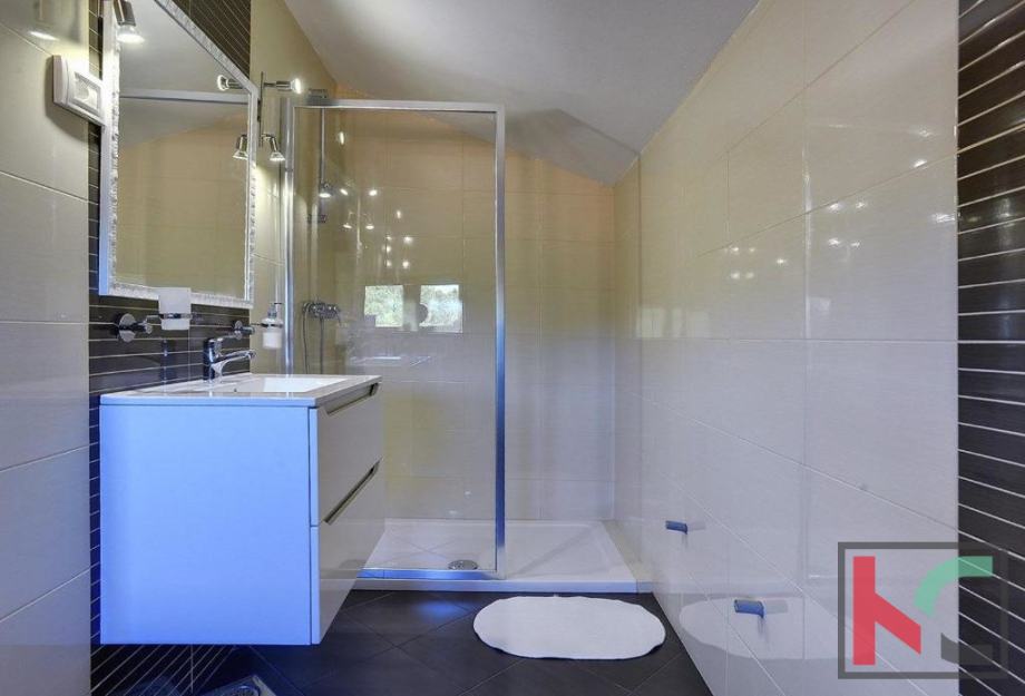 Na ulazu se nalazi veliki otvoreni dnevni boravak, blagovaonica i kuhinja koje se savršeno stapaju s vanjskim prostorom putem natkrivene terase, stvarajući idealno mjesto za opuštanje i druženje. Na istoj razini nalazi se i jedna spavaća soba s vlastitom kupaonicom, wc-om i ostavom. Stepenice vode na gornji kat gdje se nalaze još tri spavaće sobe, svaka s vlastitom kupaonicom. U podrumu se nalazi konoba s ognjištem, praonica rublja te velika prostorija za druženje koju možete prilagoditi prema vlastitim potrebama. Osim toga, kuća nudi garažu za dva vozila, dodajući praktičnost.