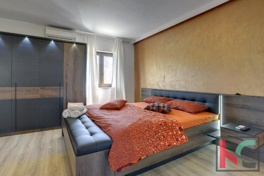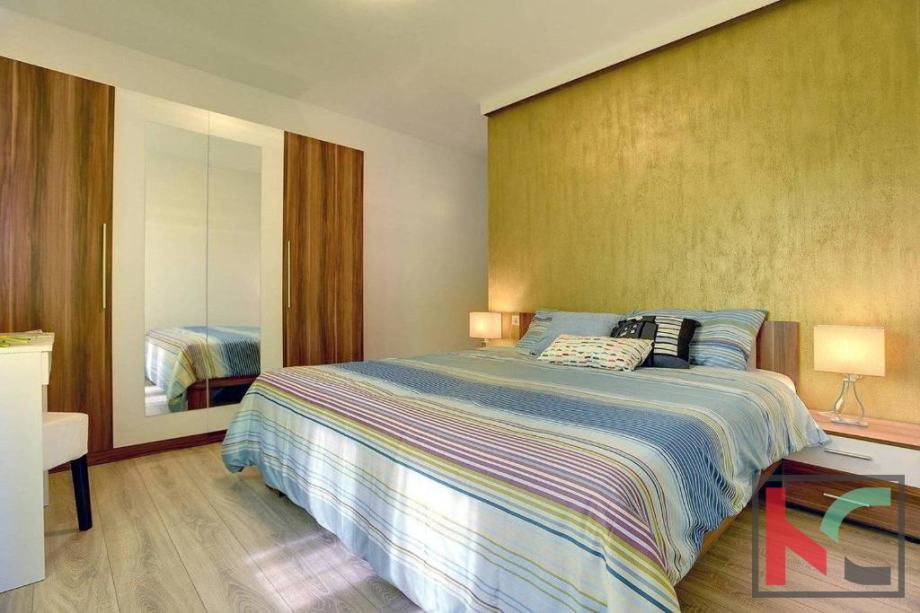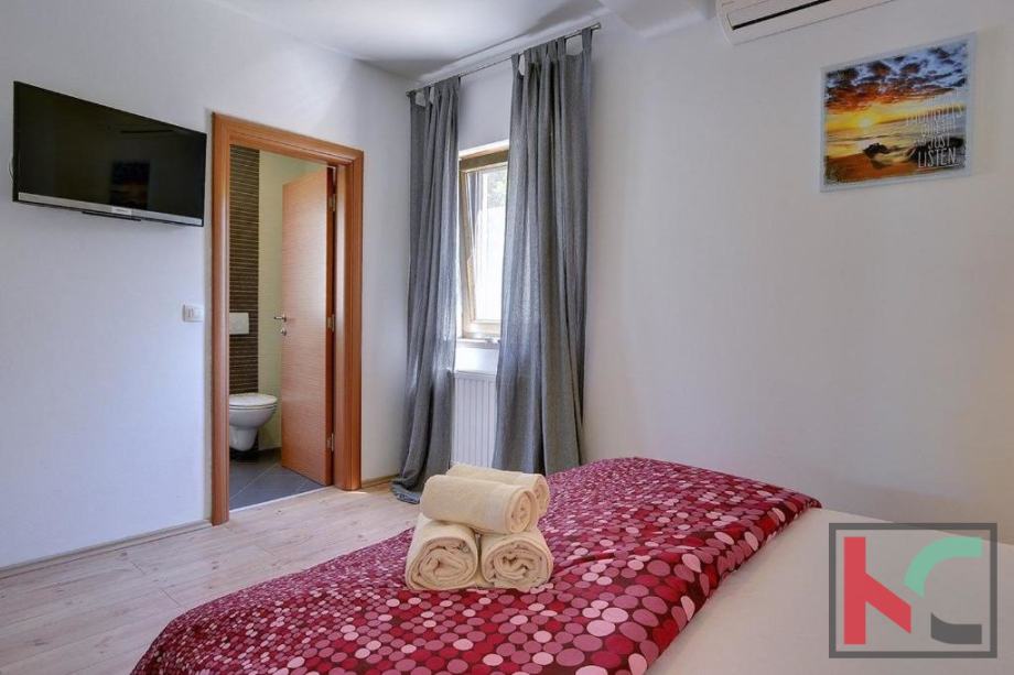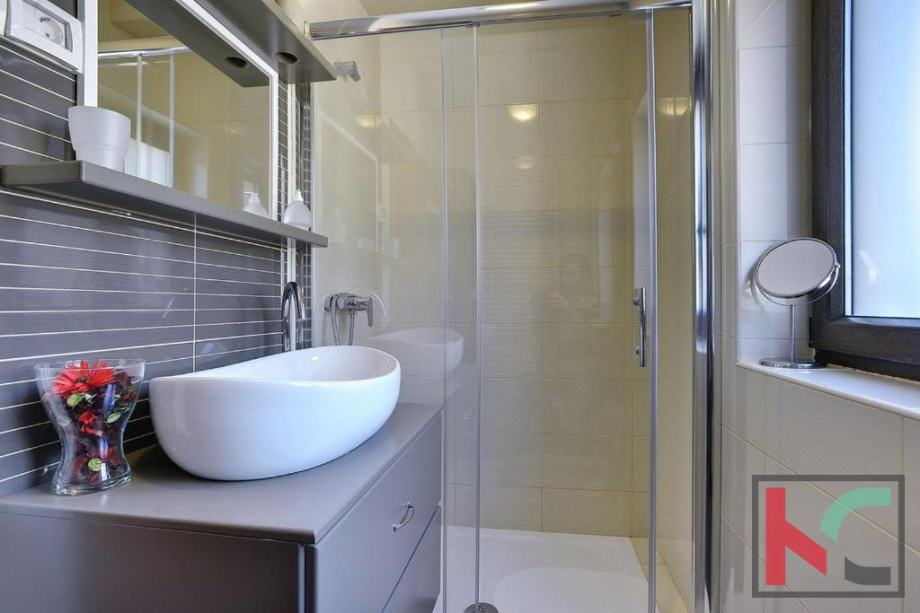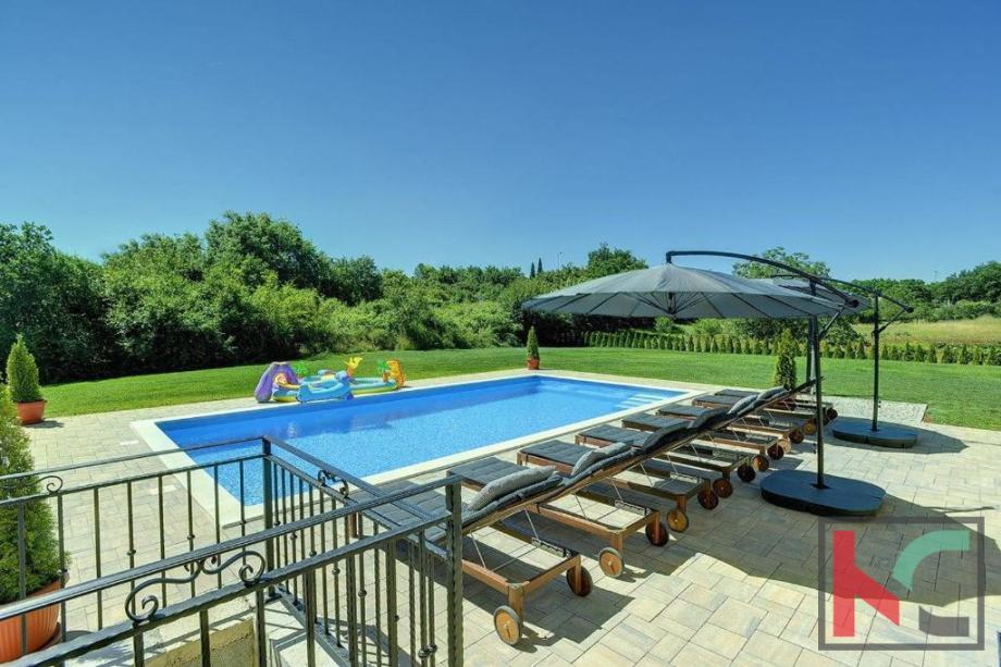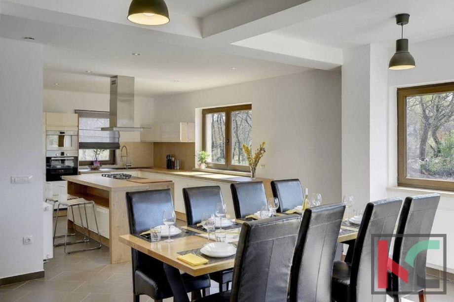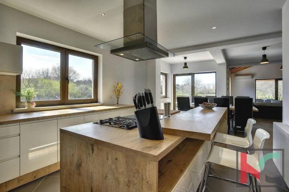 Na ulazu se nalazi veliki otvoreni dnevni boravak, blagovaonica i kuhinja koje se savršeno stapaju s vanjskim prostorom putem natkrivene terase, stvarajući idealno mjesto za opuštanje i druženje. Na istoj razini nalazi se i jedna spavaća soba s vlastitom kupaonicom, wc-om i ostavom. Stepenice vode na gornji kat gdje se nalaze još tri spavaće sobe, svaka s vlastitom kupaonicom. U podrumu se nalazi konoba s ognjištem, praonica rublja te velika prostorija za druženje koju možete prilagoditi prema vlastitim potrebama. Osim toga, kuća nudi garažu za dva vozila, dodajući praktičnost.