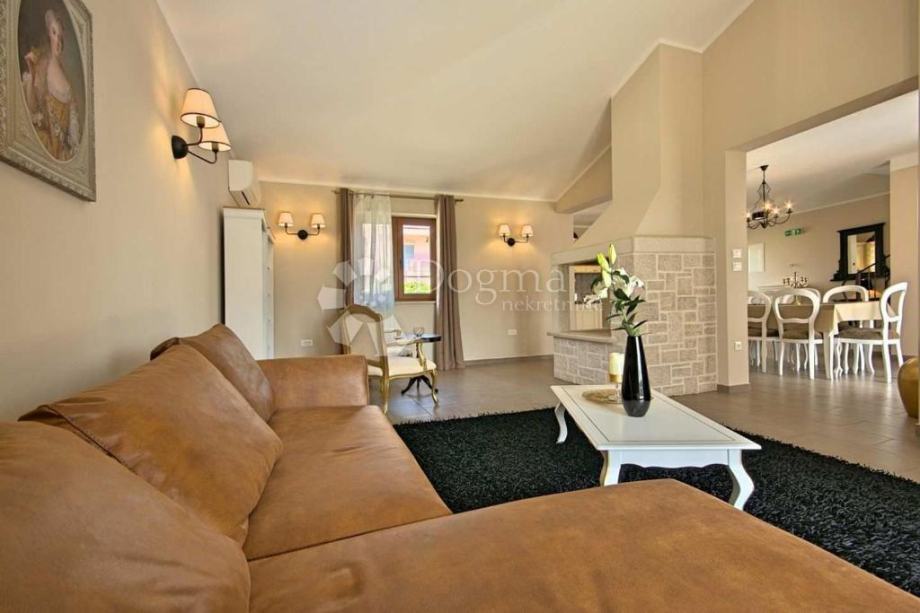 U prizemlju se smjestio prostrani dnevni boravak sa kaminom i kožnom garniturom sa izlazom na plažu bazena, zatim, jedna spavaća soba sa kupaonom i izlazom na terasu, gostinjski toalet, kompletno opremljena elegantna kuhinja sa blagovaonom.