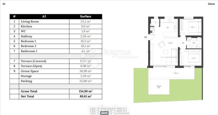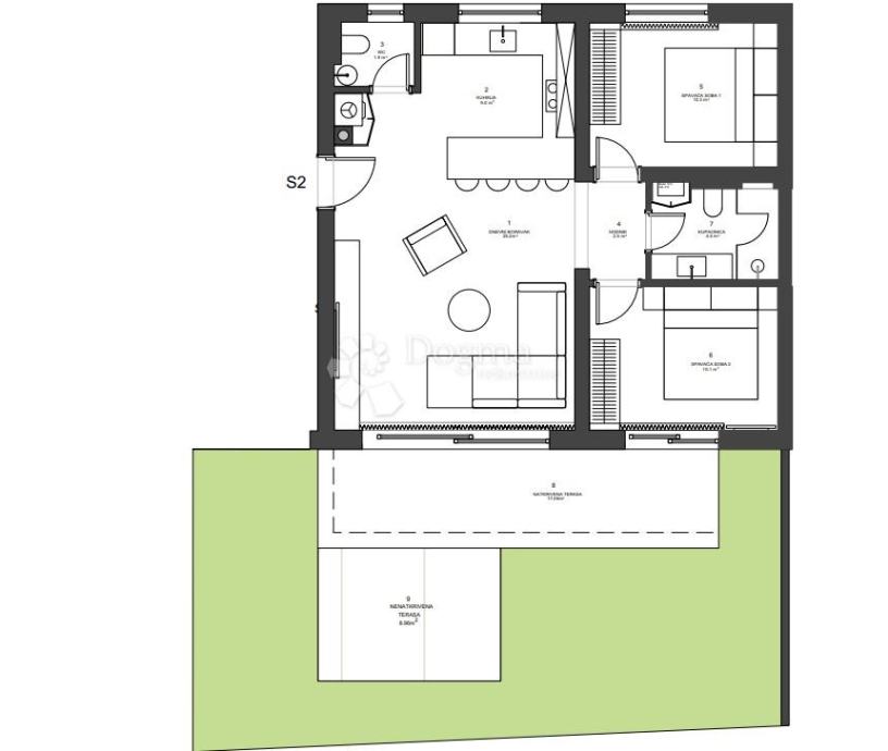 Stan A2, s neto površinom od 89,61 m², pruža savršenu ravnotežu između unutarnjeg i vanjskog života. Unutra se nalaze dvije spavaće sobe, kupaonica, dodatni WC, svijetli dnevni boravak i moderna kuhinja. Vanjski prostori otvaraju se u jednu natkrivenu i jednu otvorenu terasu (ukupno 26 m²) te privatni zeleni kutak od 36,99 m² – savršeno mjesto za jutarnju kavu, roštilj s prijateljima ili odmor u hladu masline.
