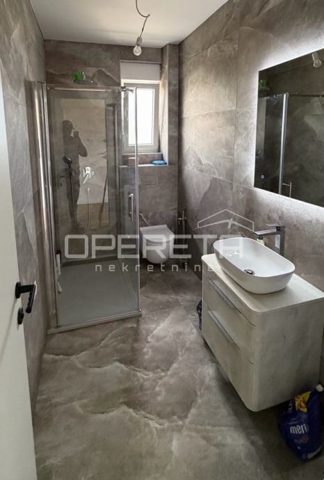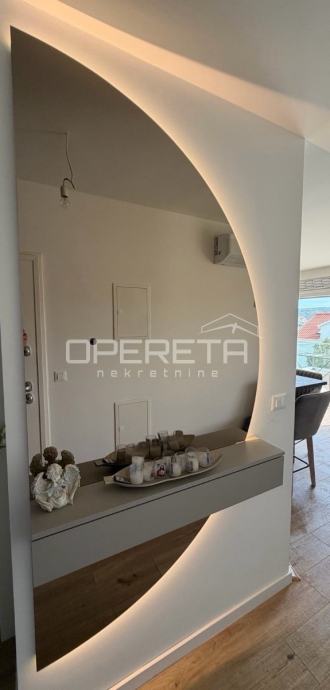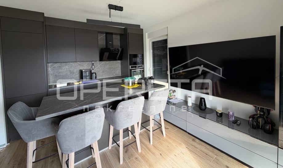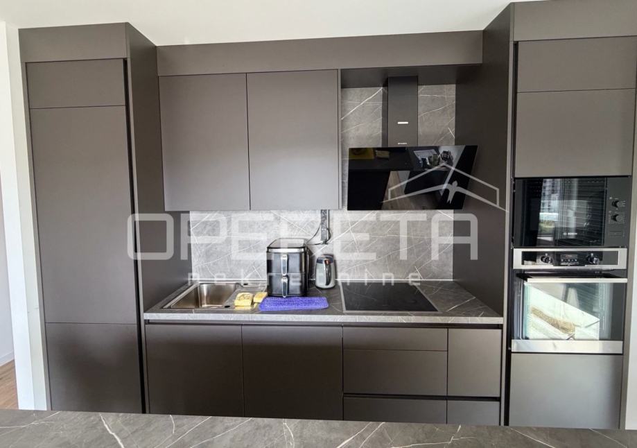 Stan je u potpunosti namješten i opremljen vrhunskim uređajima — kuhinjski aparati Bosch, kuhinja DanKüchen po mjeri, udoban namještaj i velik Samsung TV od 75 inča stvaraju dojam luksuza bez pretjerivanja. Udobnost dodatno osiguravaju podno grijanje, klimatizacija, protuprovalna vrata i videoportafon, čineći prostor ugodnim i sigurnim tijekom cijele godine.