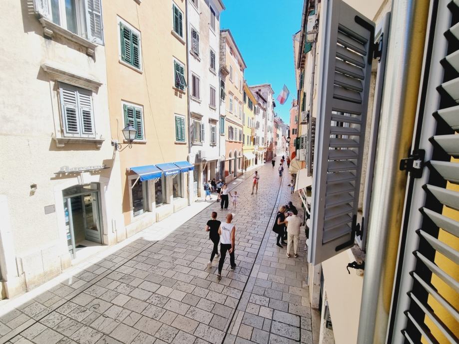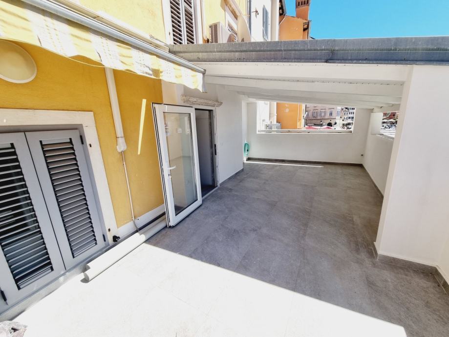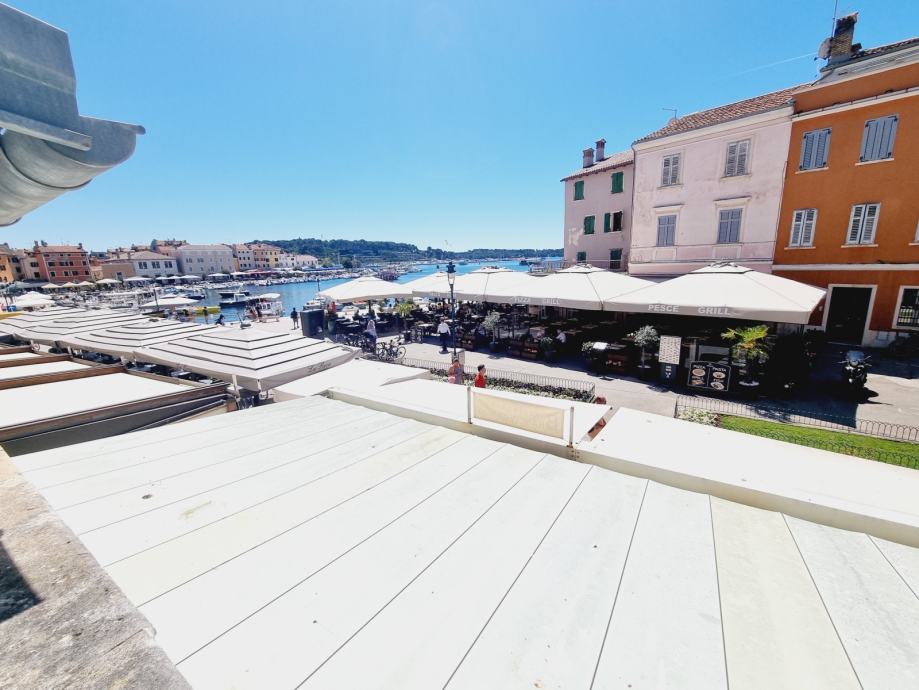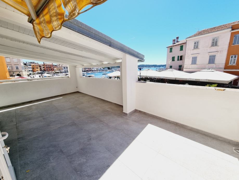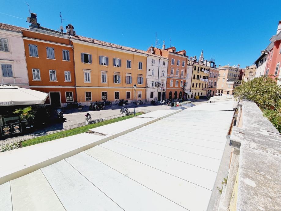 Ova se nekretnina nalazi na prvom katu povijesne zgrade, s ulazom skrivenim u uskoj kamenoj ulici. Prostor obuhvaća 55 m2 i sastoji se od dvije spavaće sobe, kupaonice i kombinirane kuhinje i dnevnog boravka. Dnevni boravak otvara se na jedinstvenu terasu - rijetkost u Rovinju - površine 20 m2 i nudi prekrasan pogled na staru gradsku jezgru i marinu.