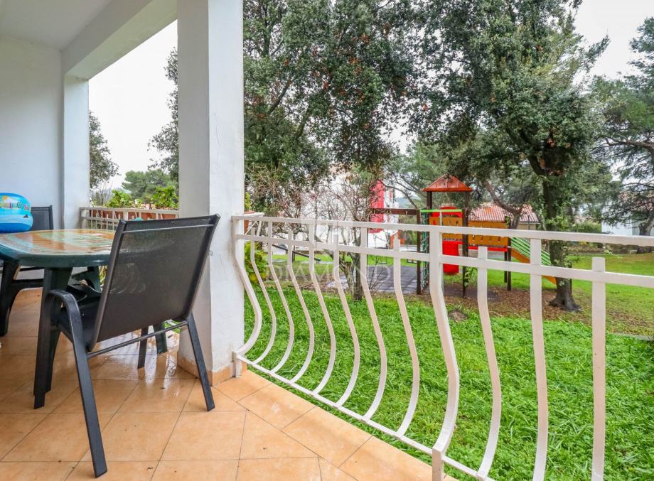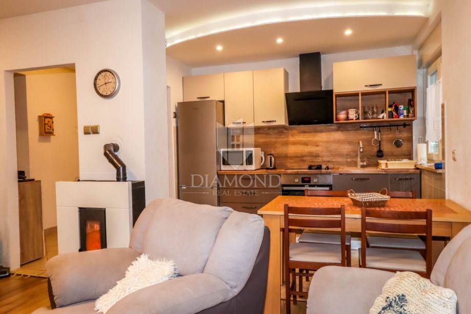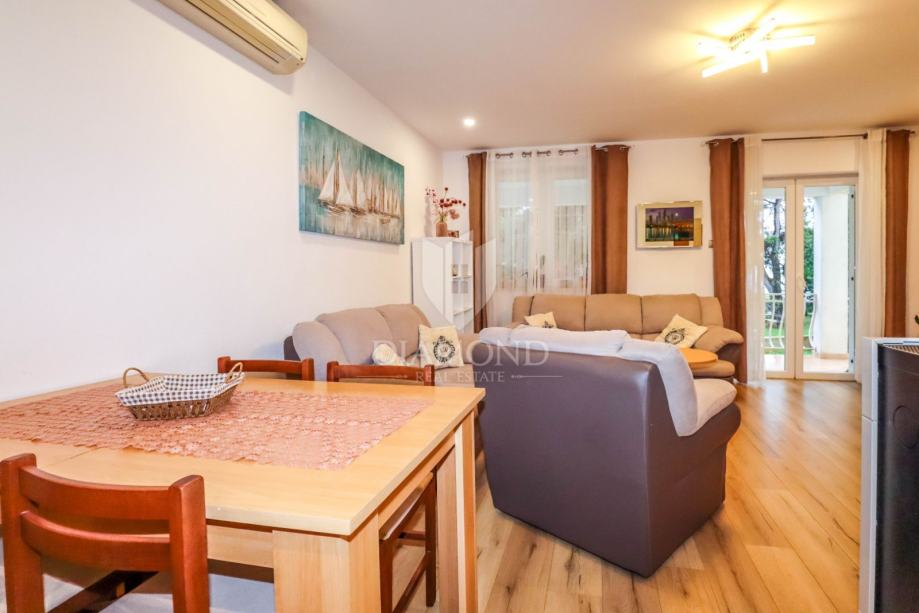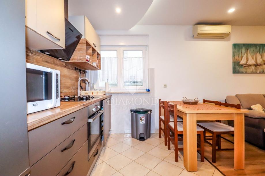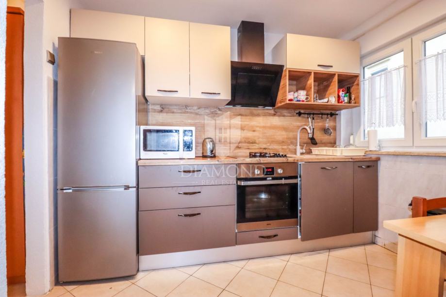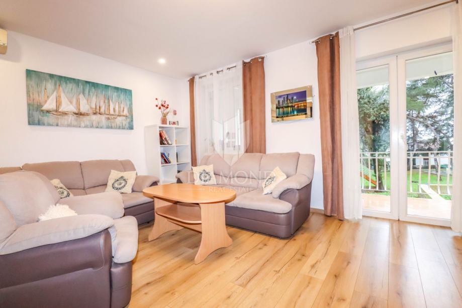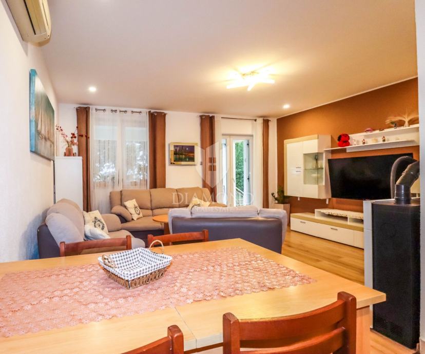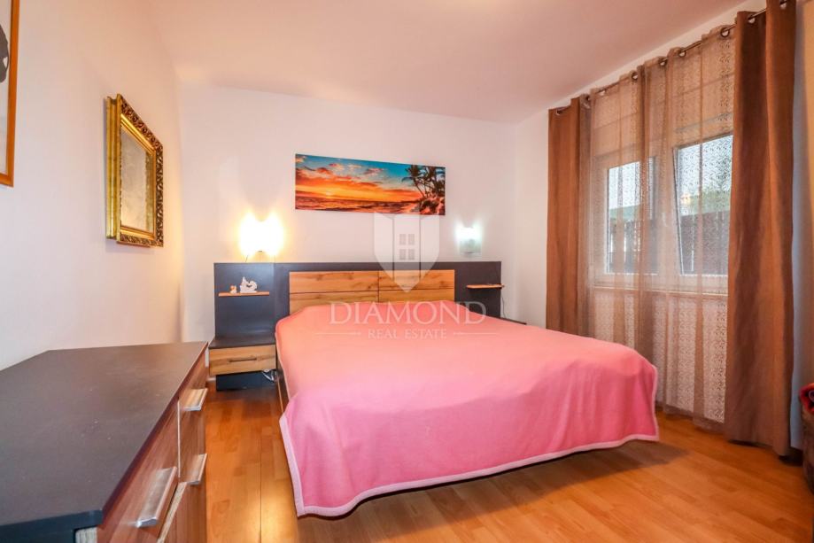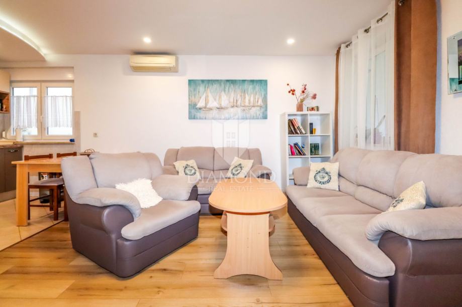 Stan od 70 m² smješten je u prizemlju kuće i dolazi s garažom od 15 m² koja uključuje sanitarni čvor. Prostrani dnevni boravak povezan je s blagovaonicom i kuhinjom u otvorenom konceptu, a izlaz na loggiu dodatno povezuje unutarnji prostor s eksterijerom. Dvije spavaće sobe i kupaonica čine ovaj stan funkcionalnim i ugodnim za boravak.