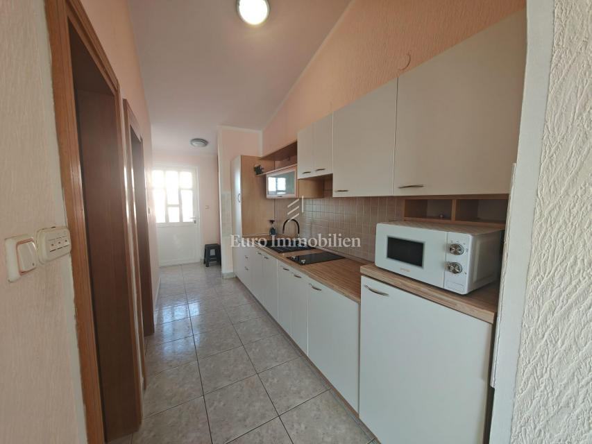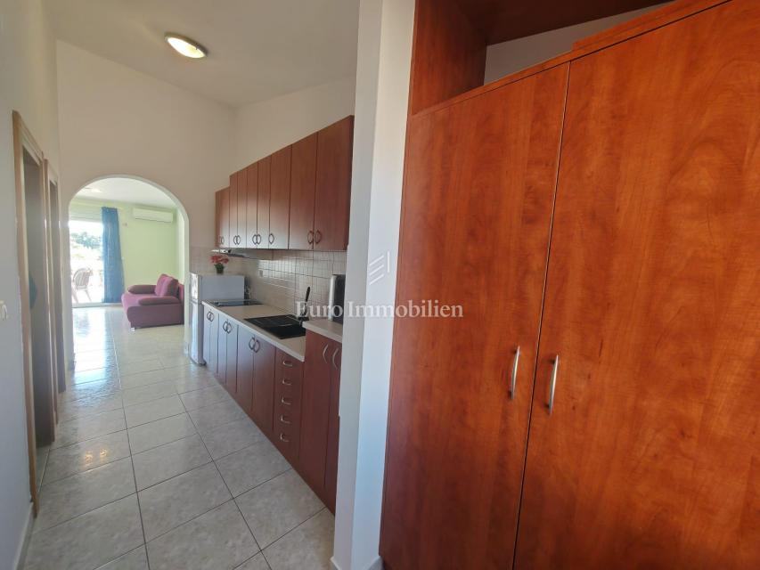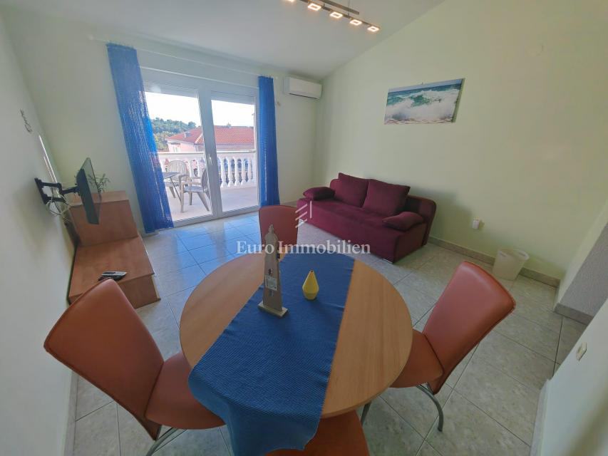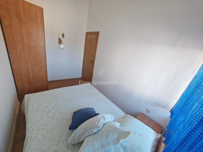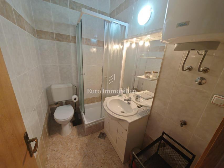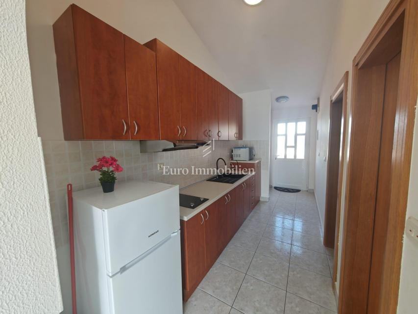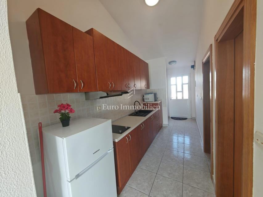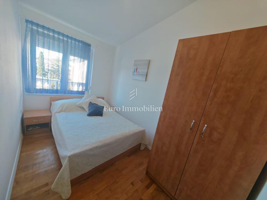 Prodaje se etaža na kraju mirne slijepe ulice koja se sastoji od dva odvojena stana. Stanovi se sastoje od ulaznog hodnika, spavaće sobe, kupaonice i dnevnog boravka s blagovaonicom. Oba stana imaju i južnu i sjevernu terasu s pogledom na more. Stanovi su izuzetno uredni, klimatizirani i odmah useljivi. Etaži pripadaju i dva parkirna mjesta na okućnici.