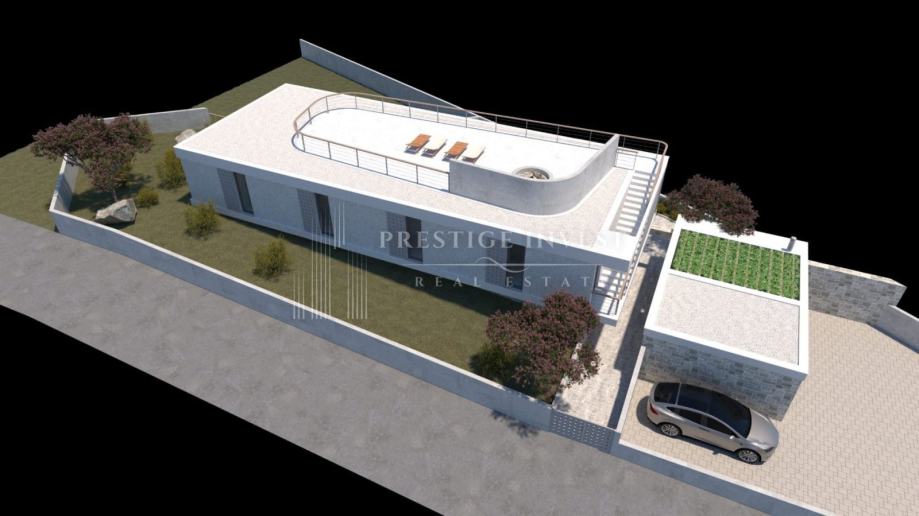 Na gornjem katu nalaze se četiri spavaće sobe, svaka s vlastitom kupaonicom, a sve sobe dijele zajednički balkon. Dodatni prostor nudi krovna terasa s nevjerojatnim panoramskim pogledom na more.