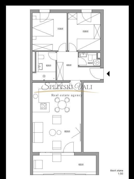 Osim dvije spavaće sobe, stan se sastoji od kuhinje s blagovaonicom, dnevne sobe, hodnika, kupatila, WC-a i prekrasne komforne lođe s otvorenim panoramskim pogledom na more.