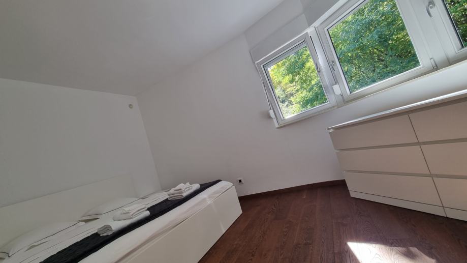 The house is located directly next to the forest in the eastern part of Maksimir. It consists of two bedrooms, a living room, a kitchen, a partitioned parking area, and a private garden.