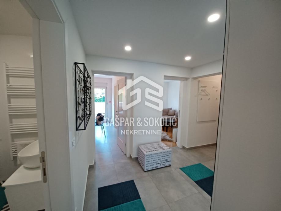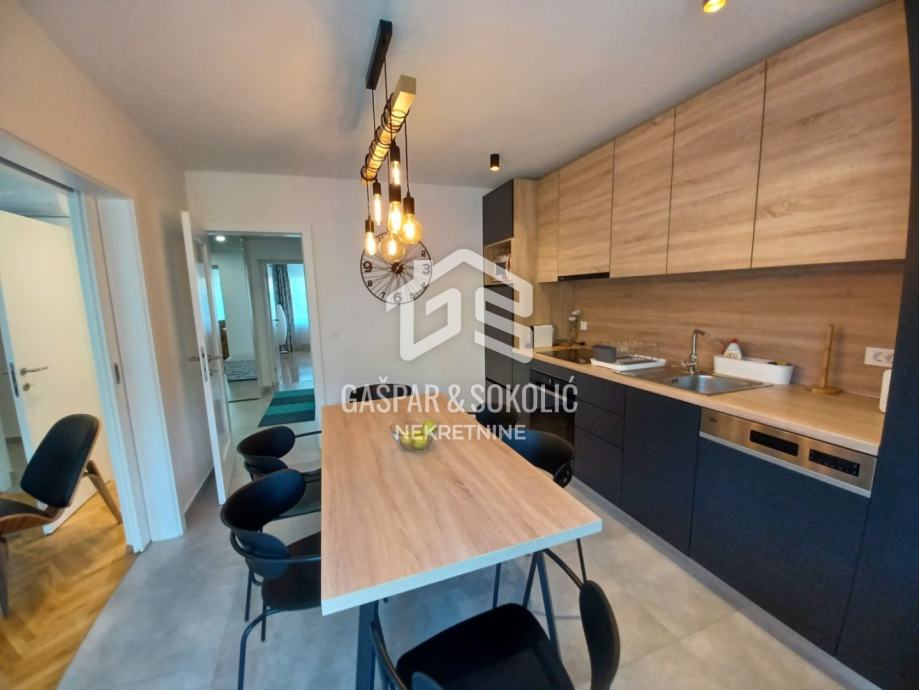 Stan se nalazi na 4 katu zgrade (s liftom) od ukupno 5 katova. Sastoji se od lijepog ulaznog prostora/hodnika, kuhinje sa blagovaonom (iz koje se izlazi na balkon, s kojeg se pruža lijep pogled na zelenilo), dnevnog boravka, koji je moguće zatvoriti kliznim vratima te odvojiti od kuhinje, ali i koristiti kao ˝open space˝. Stan ima dvije prostrane spavaće sobe i kupaonicu sa tuš kabinom.