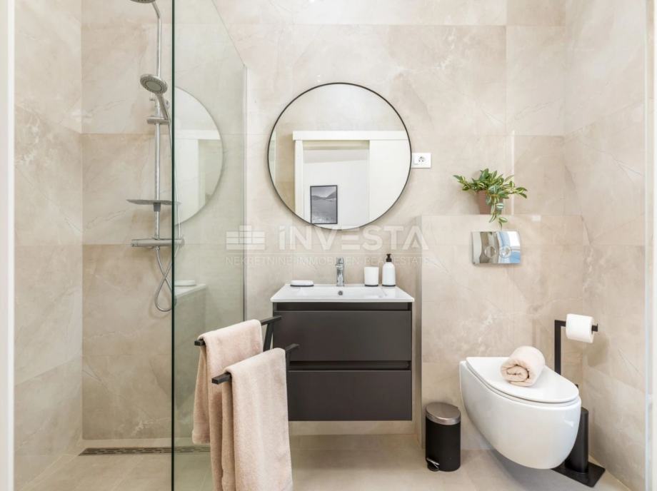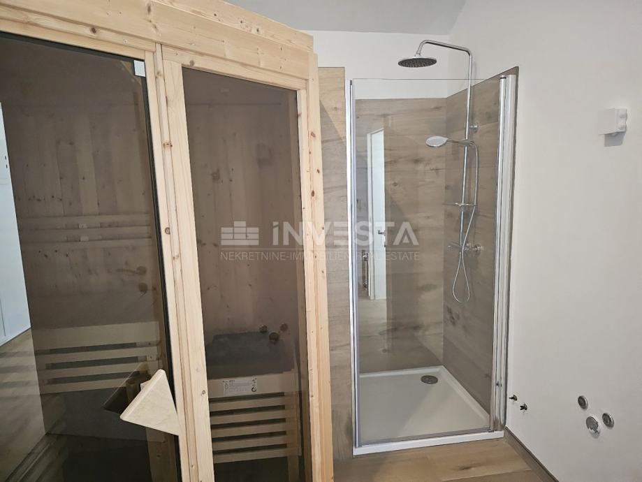 Soba s fitnessom, saunom i tušem, te izlazom na prostranu terasu od 40 m² s panoramskim pogledom na more i Brijunski arhipelag.