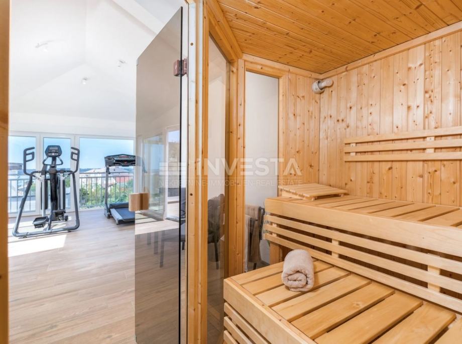 Uz prostrane sobe i luksuzne kupaonice, vila nudi i brojne dodatne sadržaje poput bazena, ljetne kuhinje, fitness sobe i saune. Okućnica je pažljivo uređena s automatskim navodnjavanjem i prostranim travnjakom, čime se osigurava opuštajući ambijent za uživanje na otvorenom.