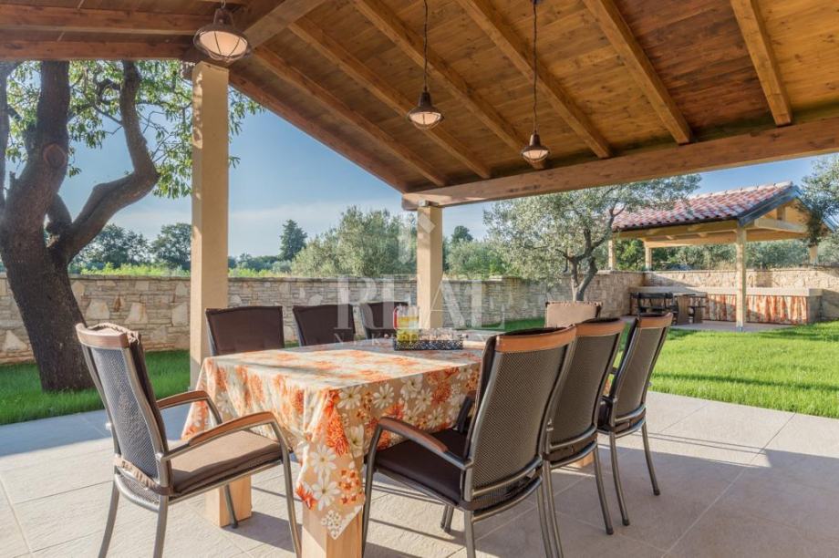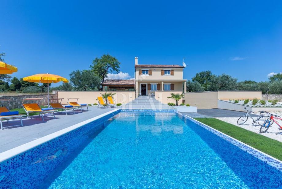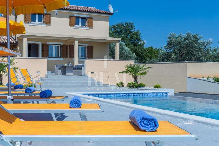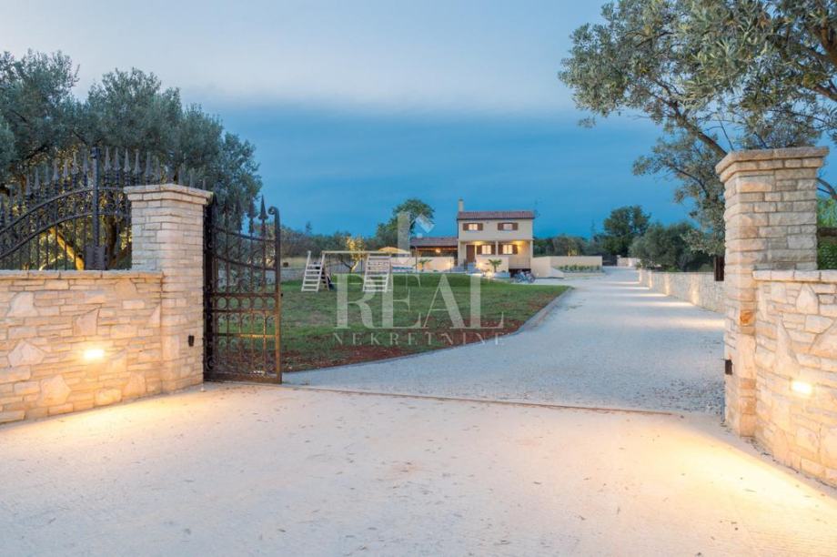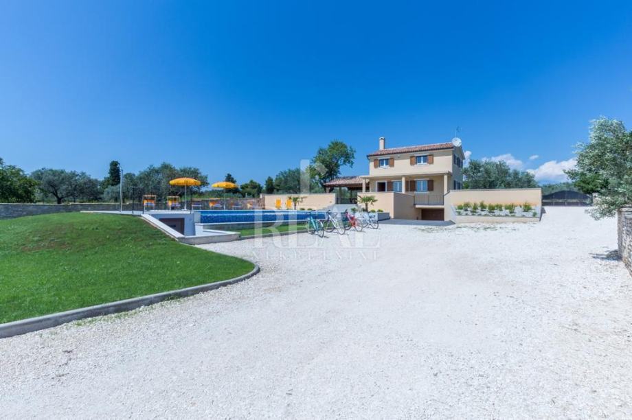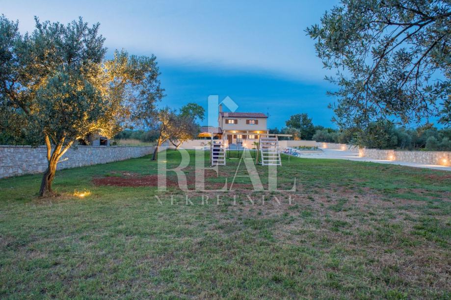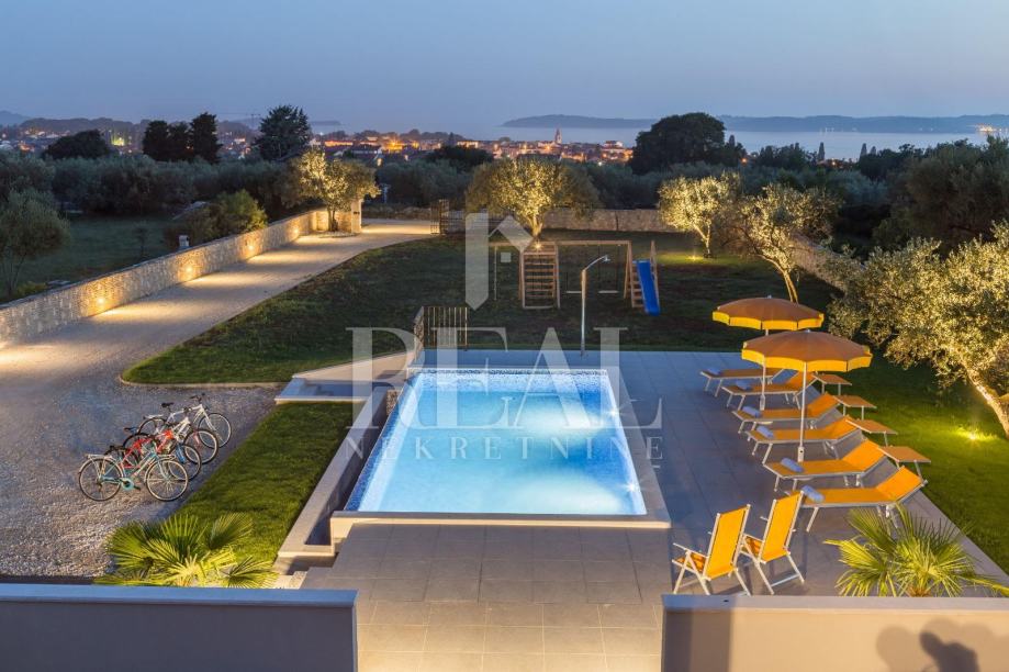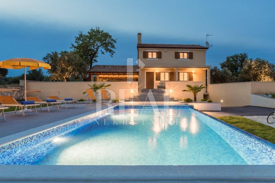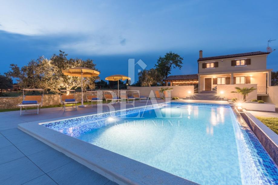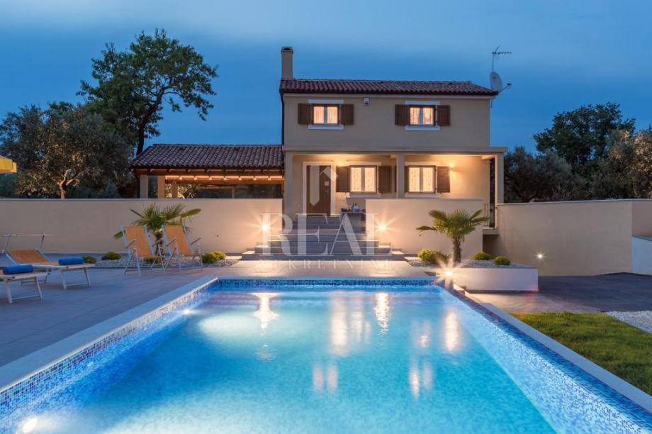 Okružena je zelenilom na samini a svega 700m je udaljena od uređene plaže za kupanje.Objekt ima prizemlje i prvi kat i sa oba dvije etaže se proteže prekrasan pogled na more i Brijunsko otočje.U prizemlju nekretnine nalazi se prostrani dnevni boravak sa kuhinjom i blagavaonicom koji imaju direktan izlaz na terasu i bazen te veliku uređenu okućnicu .Na katu su tri spavaće sobe i kupaonice.Grijanje u objektu je na klima uređeje i kamin na kruta goriva.