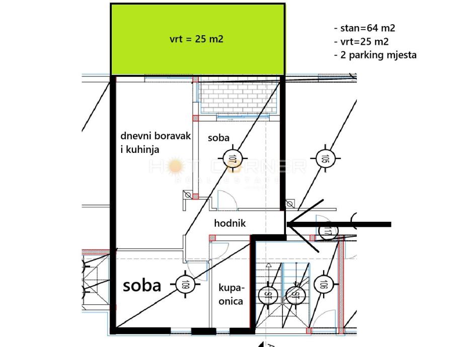 2 spavaće sobe, kupaonice, kuhinje i dnevnog boravka, lođe, te vrta od 25 m2.