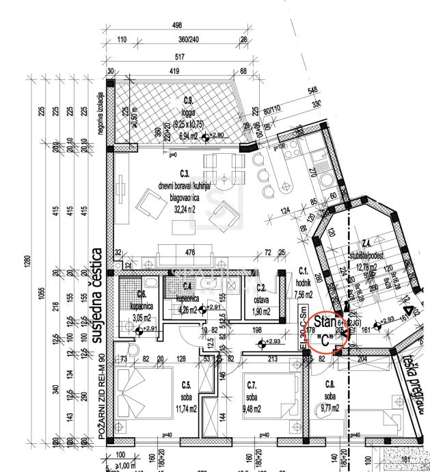 - dnevni boravak s kuhinjom i blagovaonicom: 32,24 m²