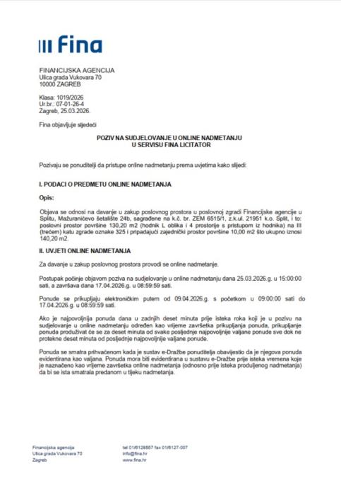 Objava se odnosi na davanje u zakup poslovnog prostora u poslovnoj zgradi Financijske agencije u Splitu, Mažuranićevo šetalište 24b, sagrađene na k.č. br. ZEM 6515/1, z.k.ul. 21951 k.o. Split, i to: poslovni prostor površine 130,20 m2 (hodnik L oblika i 4 prostorije s pristupom iz hodnika) na III (trećem) katu zgrade oznake 325 i pripadajući zajednički prostor površine 10,00 m2 što ukupno iznosi 140,20 m2.