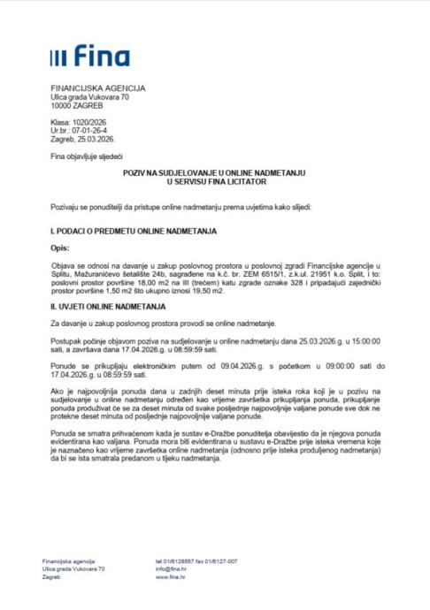 Objava se odnosi na davanje u zakup poslovnog prostora u poslovnoj zgradi Financijske agencije u Splitu, Mažuranićevo šetalište 24b, sagrađene na k.č. br. ZEM 6515/1, z.k.ul. 21951 k.o. Split, i to: poslovni prostor površine 18,00 m2 na III (trećem) katu zgrade oznake 328 i pripadajući zajednički prostor površine 1,50 m2 što ukupno iznosi 19,50 m2.