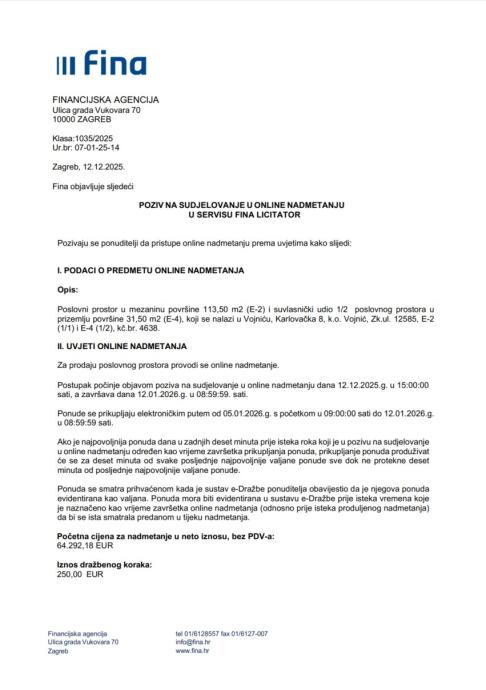 Poslovni prostor u mezaninu površine 113,50 m2 (E-2) i suvlasnički udio ½ poslovnog prostora u prizemlju površine 15,75 m2 (E-4), koji se nalazi u Vojniću, Karlovačka 8, k.o. Vojnić, Zk.ul. 12585, E-2 (1/1) i E-4 (1/2), kč.br. 4638.