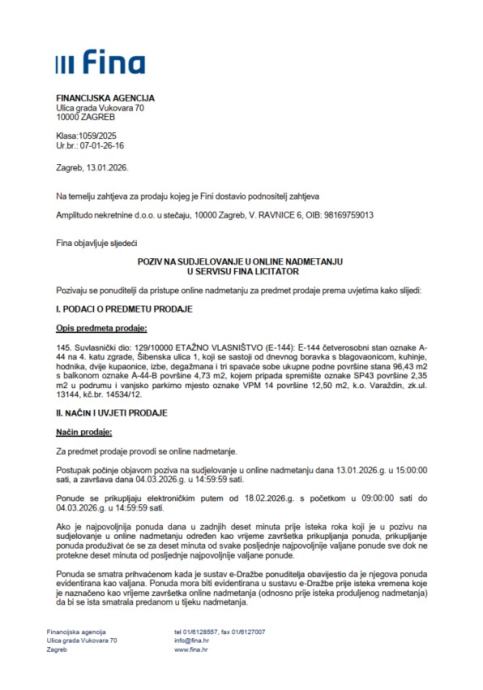 145. Suvlasnički dio: 129/10000 ETAŽNO VLASNIŠTVO (E-144): E-144 četverosobni stan oznake A-44 na 4. katu zgrade, Šibenska ulica 1, koji se sastoji od dnevnog boravka s blagovaonicom, kuhinje, hodnika, dvije kupaonice, izbe, degažmana i tri spavaće sobe ukupne podne površine stana 96,43 m2 s balkonom oznake A-44-B površine 4,73 m2, kojem pripada spremište oznake SP43 površine 2,35 m2 u podrumu i vanjsko parkirno mjesto oznake VPM 14 površine 12,50 m2, k.o. Varaždin, zk.ul. 13144, kč.br. 14534/12.