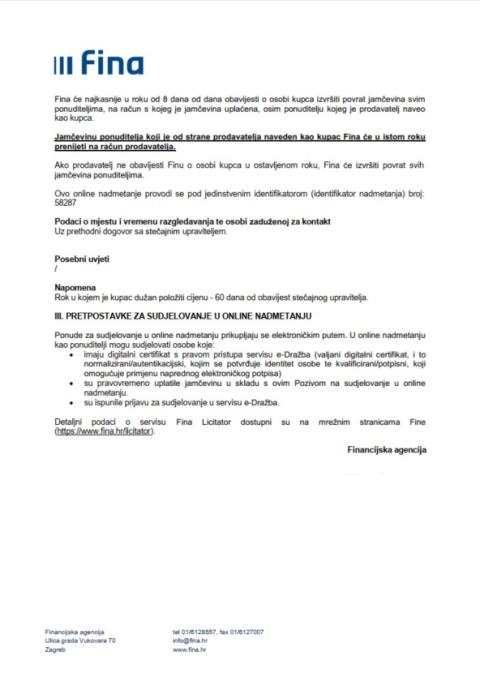 Prodaje se slobodno od osoba i stvari. Navedena nekretnina predmet je unovčenja u stečajnom postupku koji se vodi pred Trgovačkim sudom u Zagrebu.