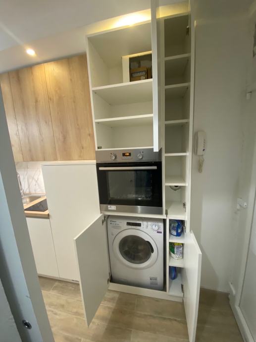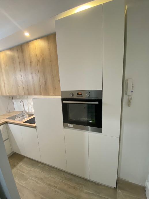 Kuhinja je kompletno nova - opremljena ugradbenim aparatima uključujući ugradnu pećnicu, ploču, hladnjak i LED rasvjetu. Radna površina kombinira drveni dekor i bijele elemente s mramornom zonom kod sudopera. Ormarići nude dosta prostora za pohranu. Stan je kompletno uređen 2023. godine , a prije 3 mjeseca ugrađen je novi klimatizacijski uređaj Mitsubishi AY koji instantno i idealno zagrijava prostor na najnižim temperaturama. U stanu se također nalazi i plinska instalacija. Režije se male i iznose oko 50€ u najhladnijim zimskim danima. Stanu pripada i zajednički parkirni prostor za stanare u sklopu dvorišta zgrade.