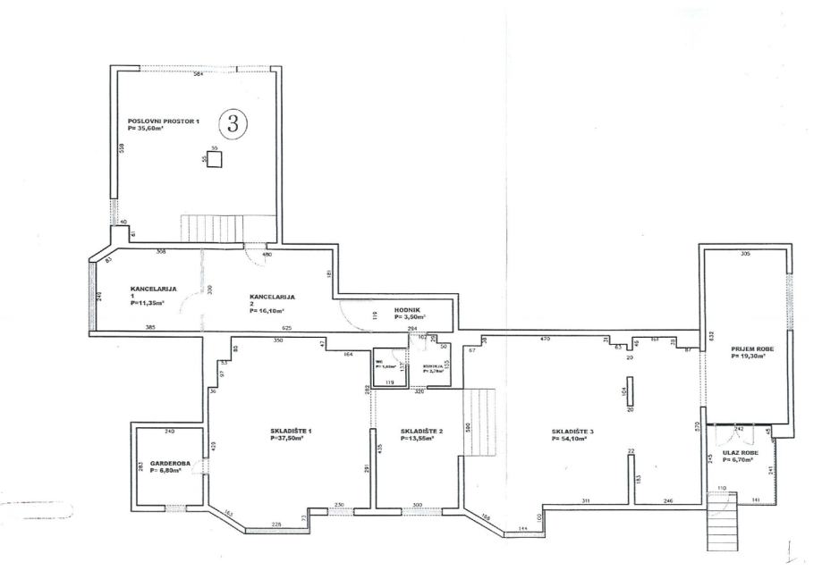ulaznog dijela/prijema (6,70 m2), prostorije 1 (19,30 m2), prostorije 2 (54,10 m2), prostorije 3 (13,55 m2), wc-a, kuhinje, prostorije 4 (37,50 m2), garderobe, hodnika, 2 kancelarije ( 11,35 m2 i 16,10 m2), prostorije 5 (35,60 m2).