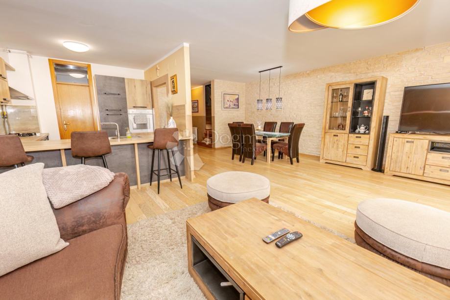Stan je komforan i funkcionalan. U prizemlju se nalazi hodnik koji vodi u prostrani 'open space' dnevni boravak s blagovaonicom i moderno opremljenom kuhinjom. Iz dnevnog boravka izlazi se na prekrasnu terasu i njegovan vrt s travnjakom i ukrasnim biljem – savršeno mjesto za jutarnju kavu ili večernja druženja. Prizemlje uključuje i praktično spremište u kojem se nalaze bojler za centralno plinsko grijanje, perilica i sušilica rublja, te dodatni toalet.