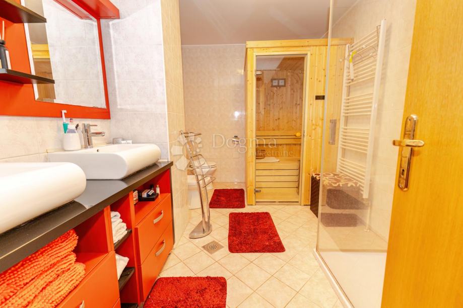 Na katu se nalaze tri udobne i elegantne spavaće sobe, jedna dječja soba te dvije kupaonice. Veća kupaonica opremljena je saunom, nudeći dodatnu razinu luksuza i opuštanja u vlastitom domu.