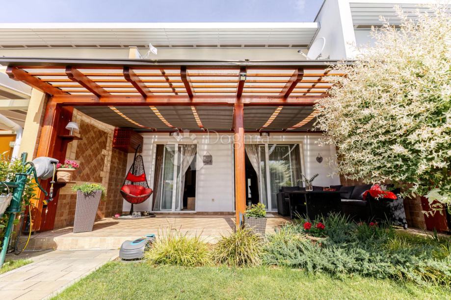 Iz dnevnog boravka izlazi se na terasu koja je stvorena za opuštanje, a iz koje se preko vrta dolazi do natkrivene nadstrešnice s velikim blagovaonskim stolom i zidanim roštiljem od cigle – idealno za druženja s obitelji i prijateljima.