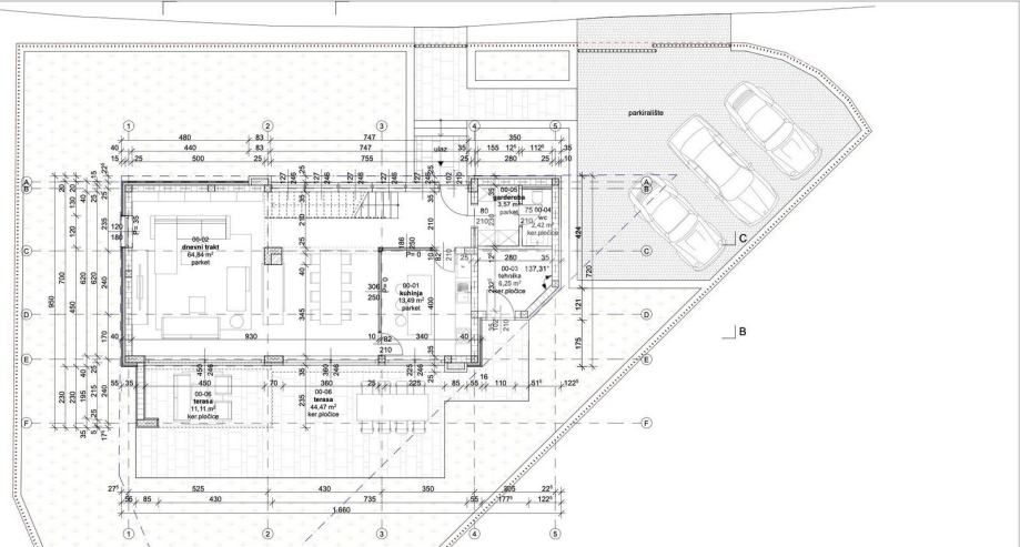 Prizemlje: Ulaz u vilu je na razini prizemlja. U sklopu ovog kata, površine 143,73 m2, se nalaze dnevni boravak s blagovaonicom 64,84 m2, kuhinja, garderoba, jedna terasa 44,47 m2, natkrivena terasa 11,11 m2, wc i kotlovnica.