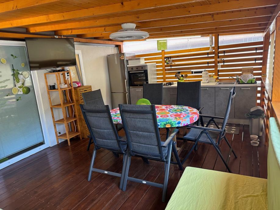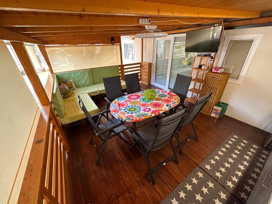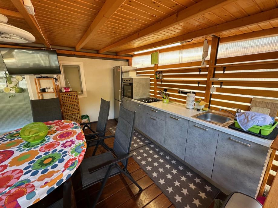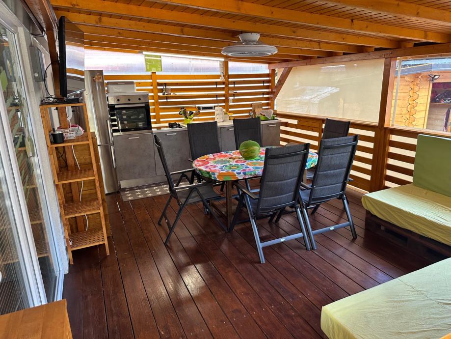 Na terasi ima veliko zunanjo kuhinjo s pečico in pomivalnim strojem, sedežno garnituro in jedilno garnituro. Hiški pripada tudi lesena uta v dimenziji 2x2 metra, v kateri je pralno-sušilni stroj in kjer je mogoče spraviti kolesa, žar, ipd.
