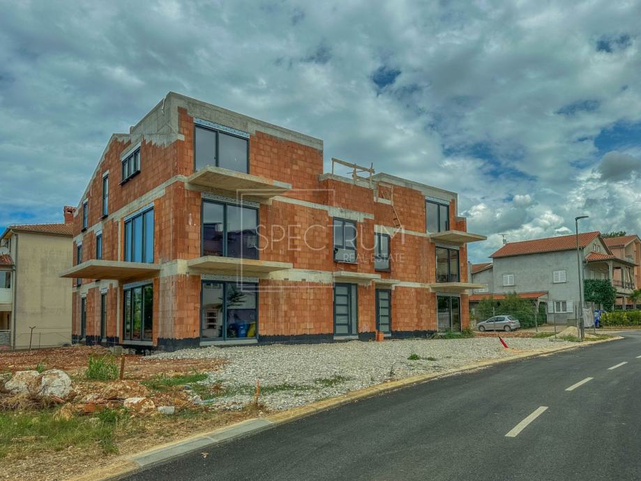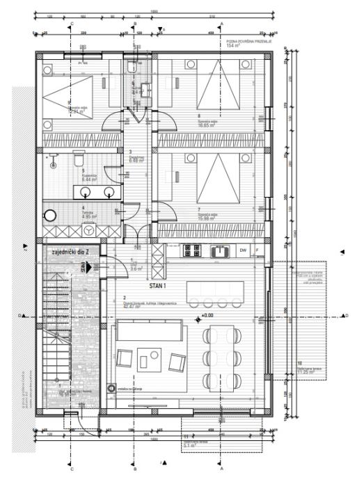 Stan se nalazi u prizemlju novoizgrađene stambene zgrade. Neto površina stana iznosi 119.35 m2. Stan se sastoji od dnevnog boravka zajedno sa kuhinjom i blagovaonicom open space koncepta kojeg karakteriziraju velike staklene stijene koje pružaju veliku količinu prirodne svjetlost, hodnika, 3 spavaće sobe, kupaonice, wc-a, tehničke sobe/praonice i terase. Na terasu se dolazi iz dnevnog boravka. U gradnji su korišteni kvalitetni materijali poput troslojne PVC stolarije. Grijanje u stanu regulirano je putem podnog grijanja i klima uređaja. Stanu pripadaju 2 parkirna mjesta.