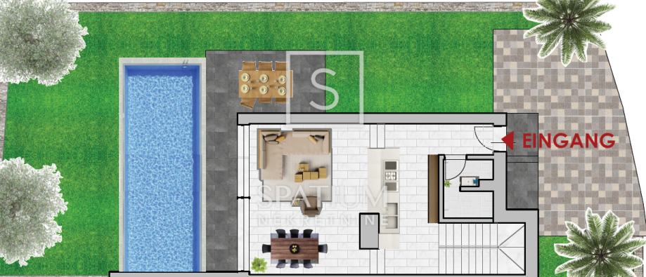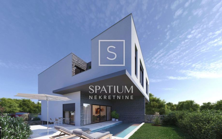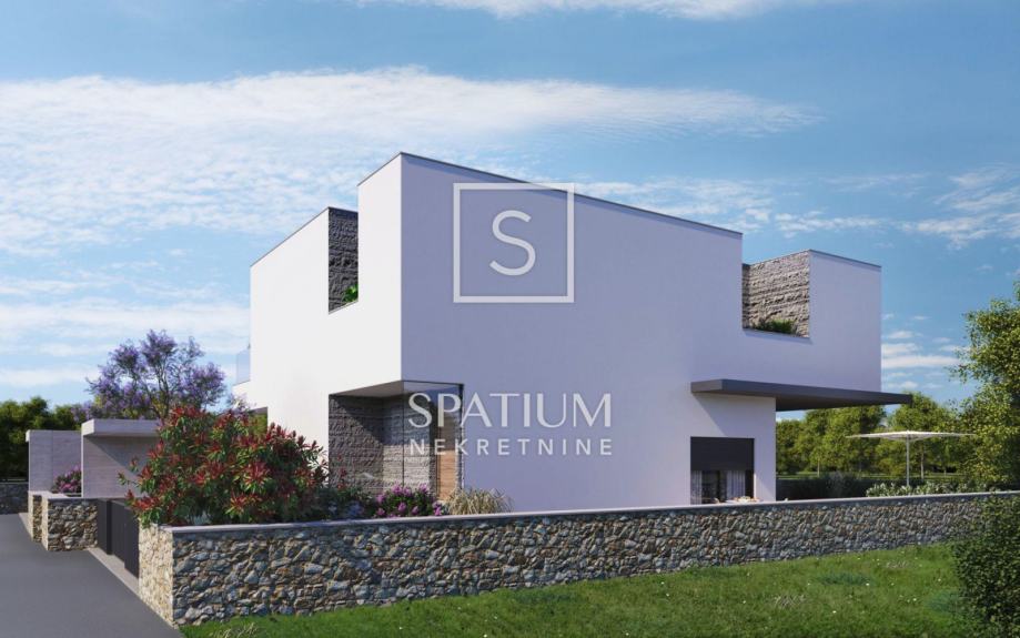 Sastoji se od suterena, prizemlja i kata s ukupno 146,23 m2. U suterenu se nalaze sauna, soba za rekreaciju i toalet. Prizemlje se sastoji od tehničke sobe, toaleta, kuhinje i blagovaonice te dnevnog boravka s izlazom na prostranu terasu te vanjski bazen. Na prvom katu nalaze se tri spavaće sobe s pripadajućim kupaonicama od kojih dvije sobe imaju izlaz na vlastite terase. Na okućnici od ukupno 229,32 m2 nalaze se vrt, terasa, bazen od 21,26 m2 te parking od 48,14 m2 namijenjen za dva automobila. Grijanje i hlađenje je omogućeno s pomoću dizalice topline "Daikin". Podno grijanje u cijelom objektu. Oprema i materijali koji se koriste u gradnji su visokog standarda gdje se obraća pozornost na kvalitetu. Kuća se nalazi na odličnoj lokaciji svega 600 metara od mora, blizina svih bitnih sadržaja.