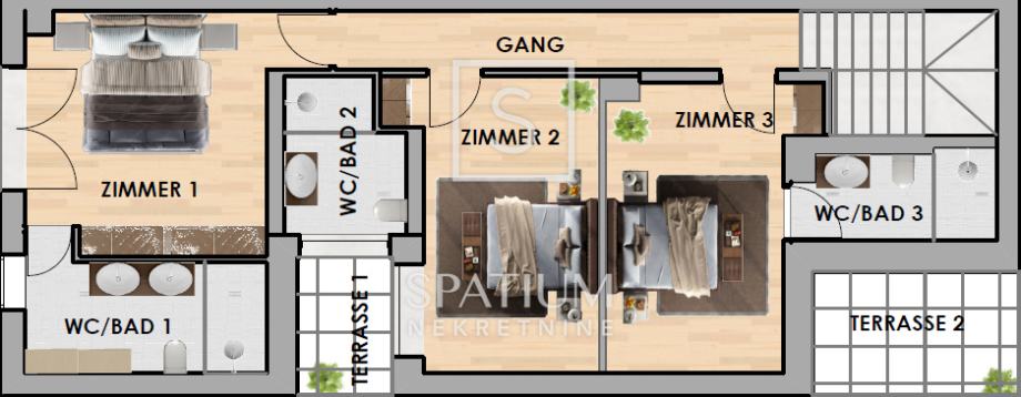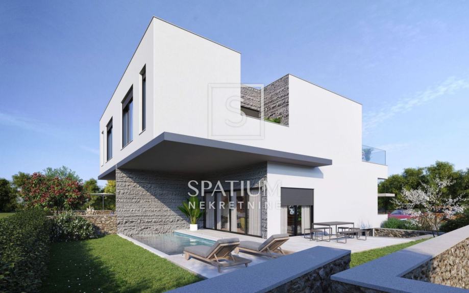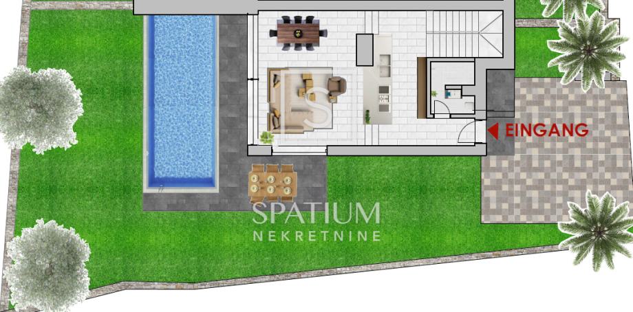 Sastoji se od suterena, prizemlja i kata s ukupno 146,23 m2. U suterenu se nalazi sauna, soba za rekreaciju i toalet. Prizemlje se sastoji od tehničke sobe, toaleta, kuhinje i blagovaonice te dnevnog boravka s izlazom na prostranu terasu te vanjski bazen. Na prvom katu nalaze se tri spavaće sobe s pripadajućim kupaonicama od kojih dvije sobe imaju izlaz na vlastite terase. Na okućnici od ukupno 253,84 m2 nalazi se vrt, terasa, bazen od 21,67 m2 te parking od 48,14 m2 namijenjen za dva automobila.