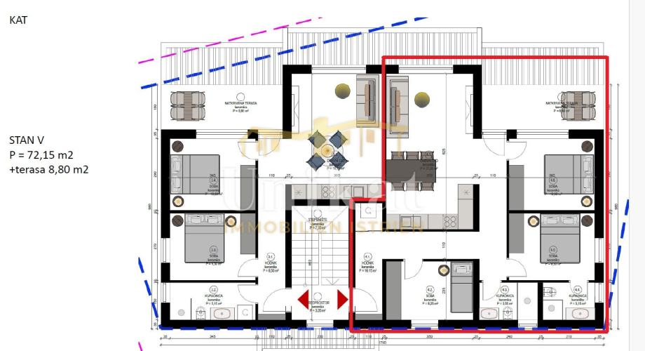 Stan se nalazi na prvom katu i sastoji se od hodnika, otvorenog dnevnog boravka s kuhinjom i blagovaonom, tri spavaće sobe, dvije kupaonice te natkrivene terase. Dodatno za sve stanare postoji bazen za zajedničko korištenje.