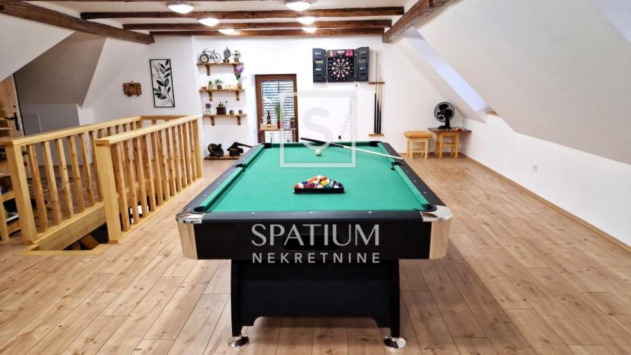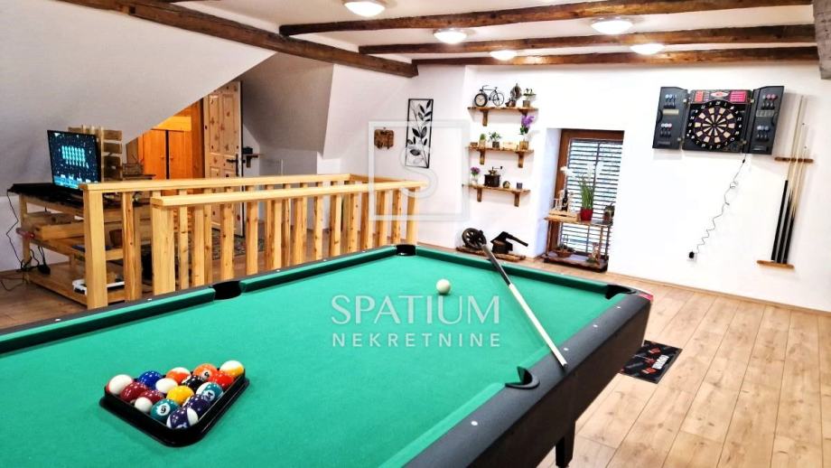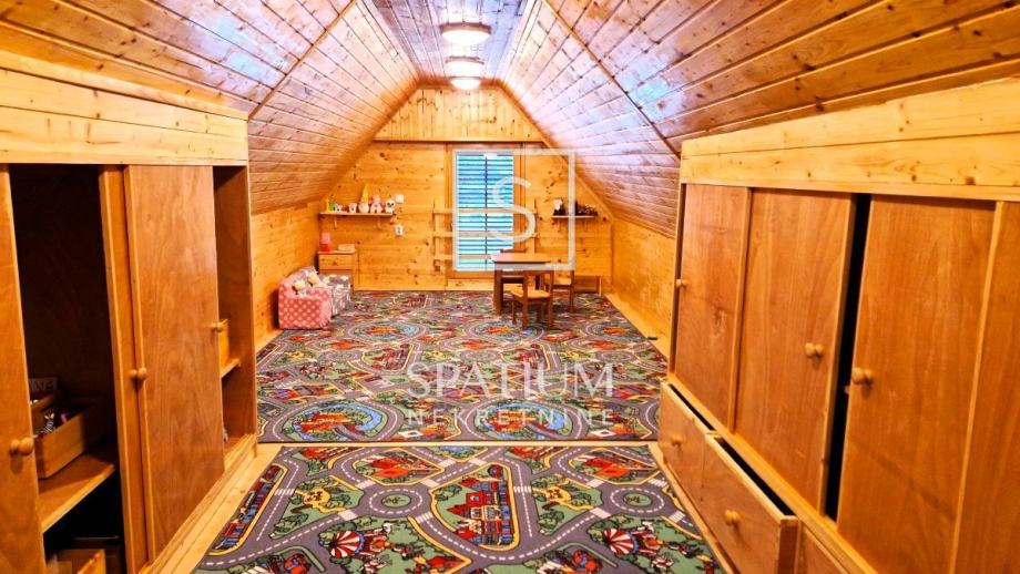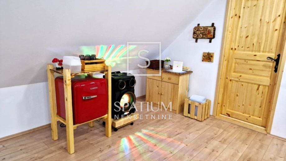 tri spavaće sobe, dvije kupaone, dječje igraonice, ostave i radnog uredskog prostora. Tlocrtne površine 153m2., ispod kuće nalazi se podrum od 100m2.