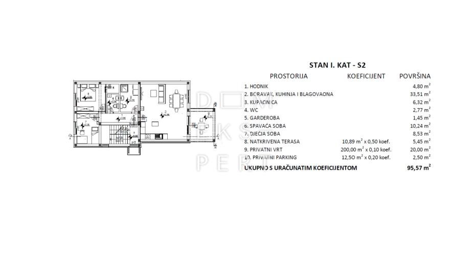 - 95.57 m² – ukupna prodajna površina s pripadcima (parkirno mjesto, natkrivena terasa i vrt obračunato prema pripadajućim koeficijentima.