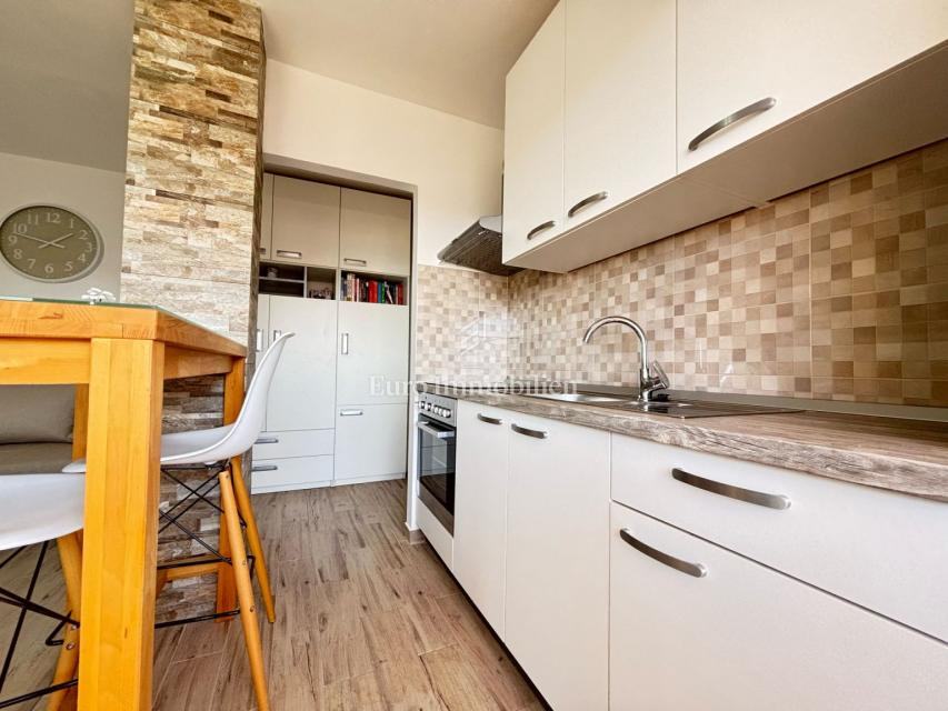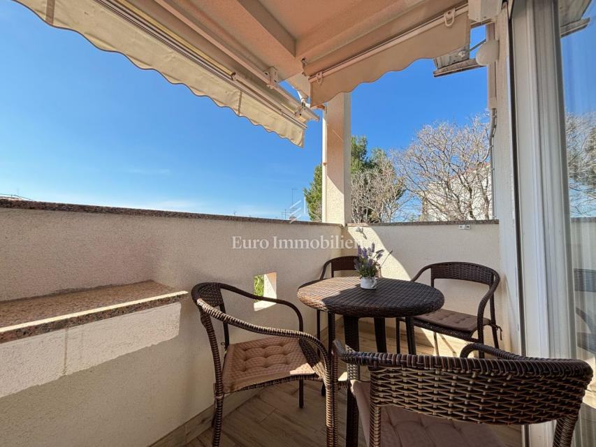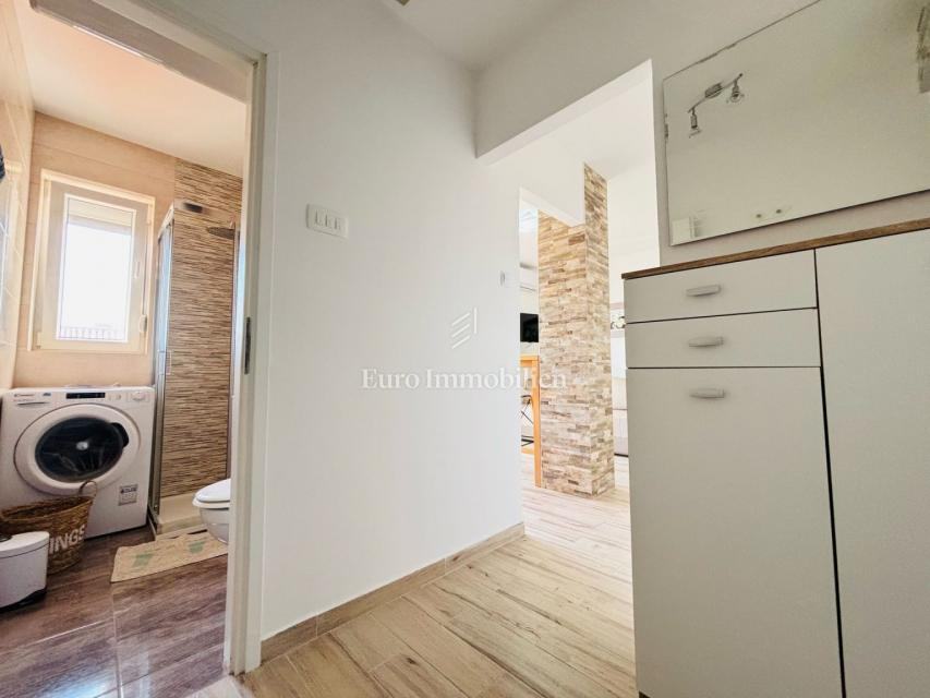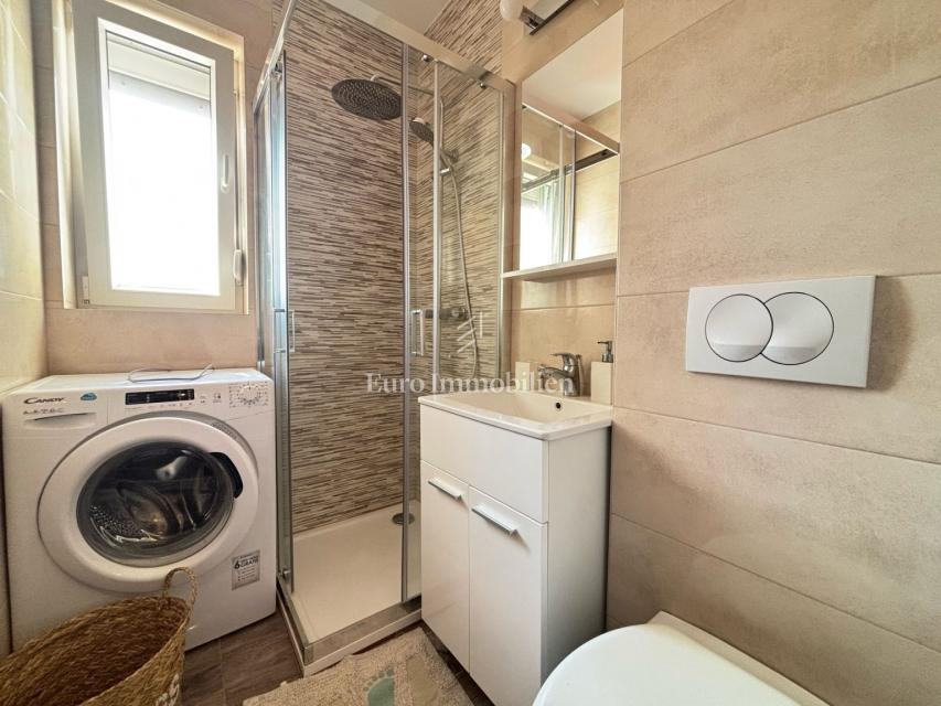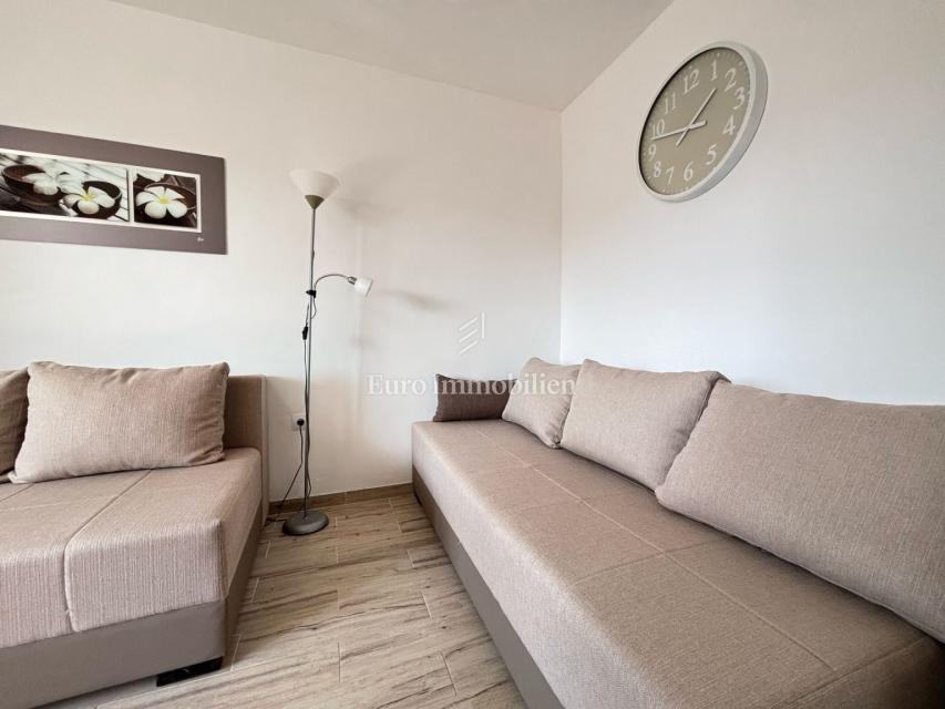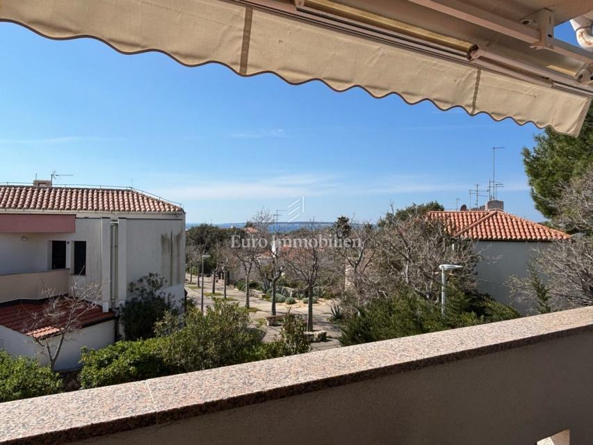 Apartman se nalazi na prvom katu i ima natkrivenu terasu s tendom i pogledom na more. Opremljen je novim namještajem i klima uređajem. Besplatan javni parking dostupan je u neposrednoj blizini, a do plaže se dolazi za samo nekoliko minuta hoda. Vlasništvo je uredno, 1/1.