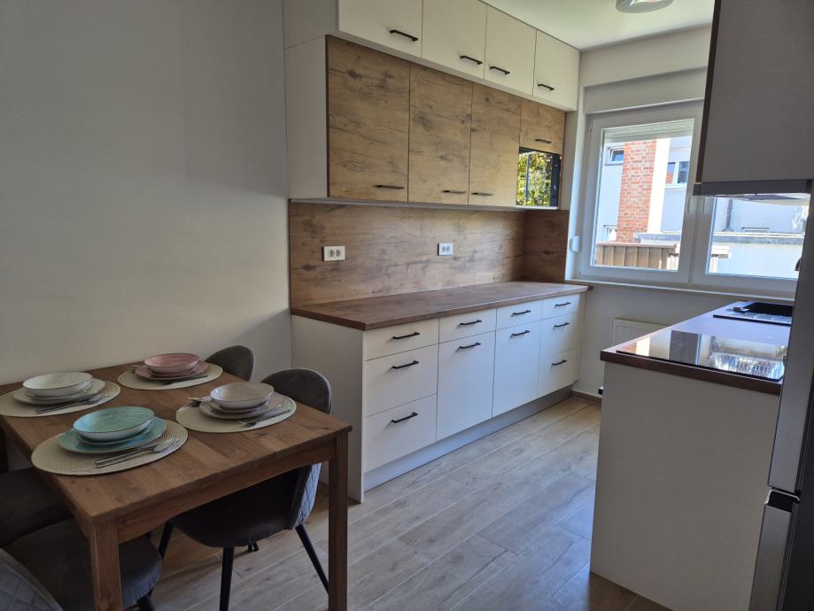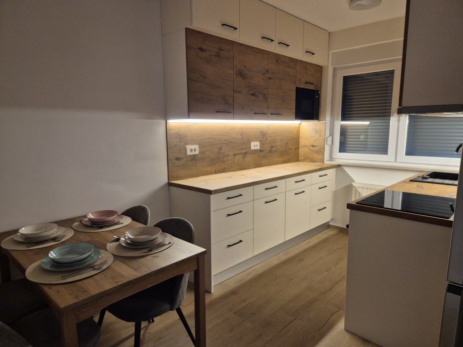 - Dvostrana kuhinja s dvoetažnim gornjim kuhinjskim elementima, perilicom posuđa, indukcijskom pločom, frižiderom, pećnicom, mikrovalnom i manjim blagovaonskim stolom.
