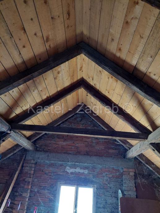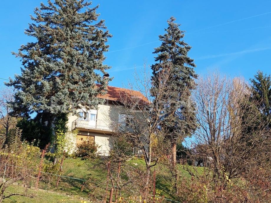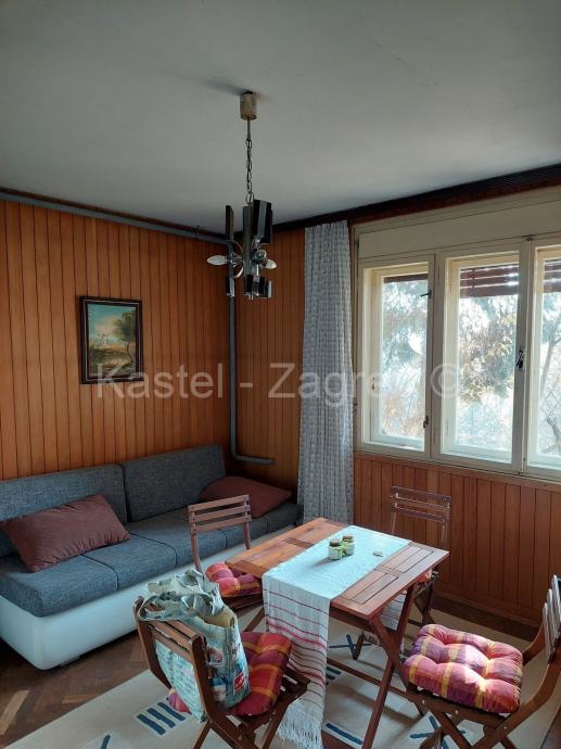 Samostojeća obiteljska kuća sa dva stana i garažom. Tlocrtna površina kuće je 99 m2. Kuća ima prizemlje sa zasebnim stanom, kat sa stanom i neuređenim potkrovljem visine sljemena 3,5 m ukupne površine cca 220 m2. Svaku etažu moguće koristiti kao zasebnu cijelinu. Na katu su tri sobe, kuhinja i kupaona. Prizemlje čine tri sobe, kupaona, kuhinja. Potkrovlje neuređeno, moguće preurediti u stambeni prostor. Kuća je na povišenom dijelu iznad ulice tako da ima nesmetan pogled na jug. Kuća je građena krajem 1960tih. Novo krovište. Trenutno se koristisamo stan na katu. Kuća je okružena zelenilom i urednim susjedstvom. Garaža je uz cestu, površine oko 25 m2. Kuća ima sve priključke.