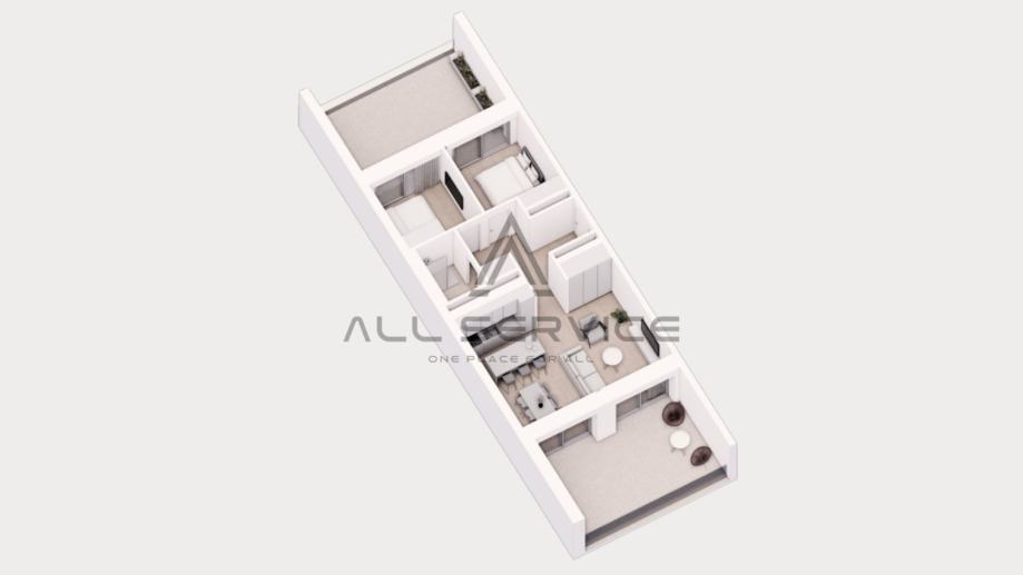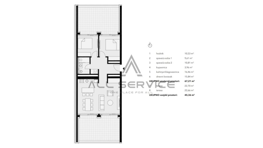 Sastoji se od: ulaznog hodnika, kupaonice i odvojenog toaleta, dvije spavaće sobe s izlazom na terasu, kuhinje s blagovaonicom i dnevnog boravka s izlazom na terasu.