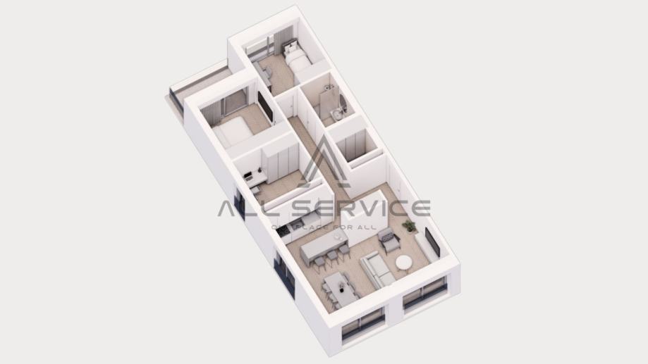 Sastoji se od: ulaznog hodnika, kupaonice i odvojenog toaleta, dvije spavaće sobe, spavaće sobe s terasom, kuhinje s blagovaonicom i dnevnog boravka.