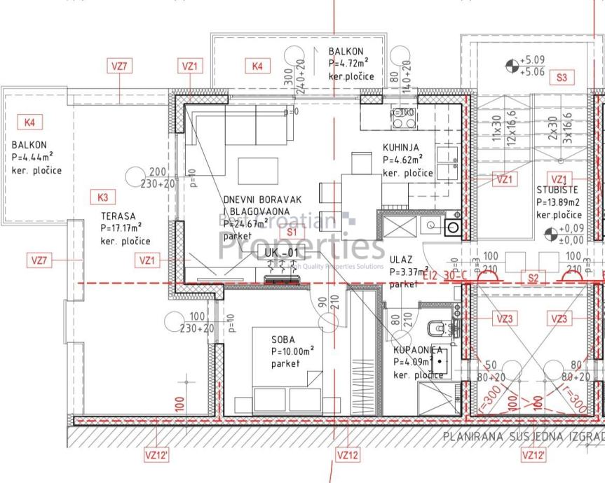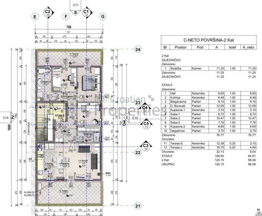 Ukupno samog stana je neto kvadrata 51.00m² po etažnom elaboratu s uračunatim koeficijentima plus parking po koef. 3.125 m2.Ukupna prodajna kvadratura iznosi 54.125m2.