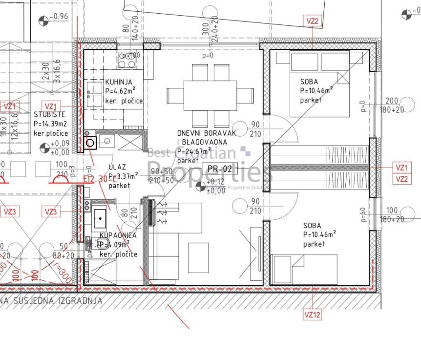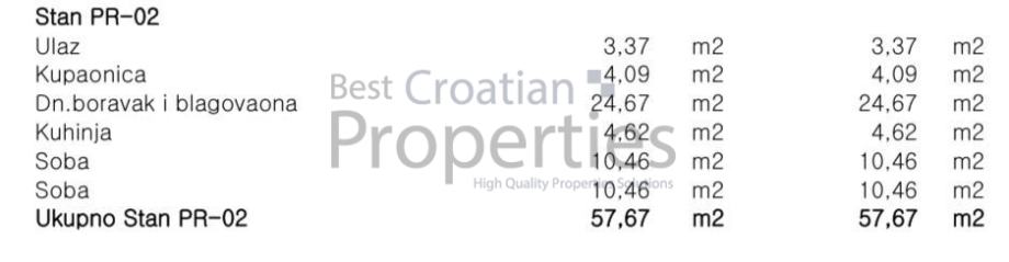 Radi se o stanu PR-02 u visokom prizemlju zgrade od ukupno 2. kata.Stan se sastoji od ulaznog hodnika/prostora (3.37m2), dnevnog boravka s blagovaonicom (24.67m2), kuhinje (4.62m2), kupaonice (4.09m2), sobe 1 (10.46 m2) te druge sobe 2 (10.46m2).